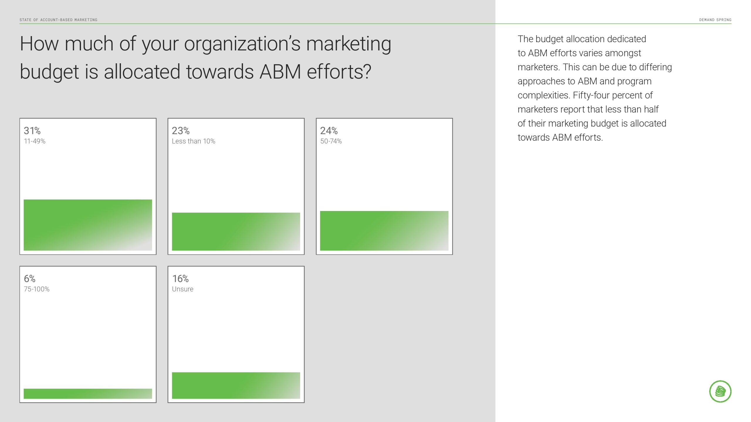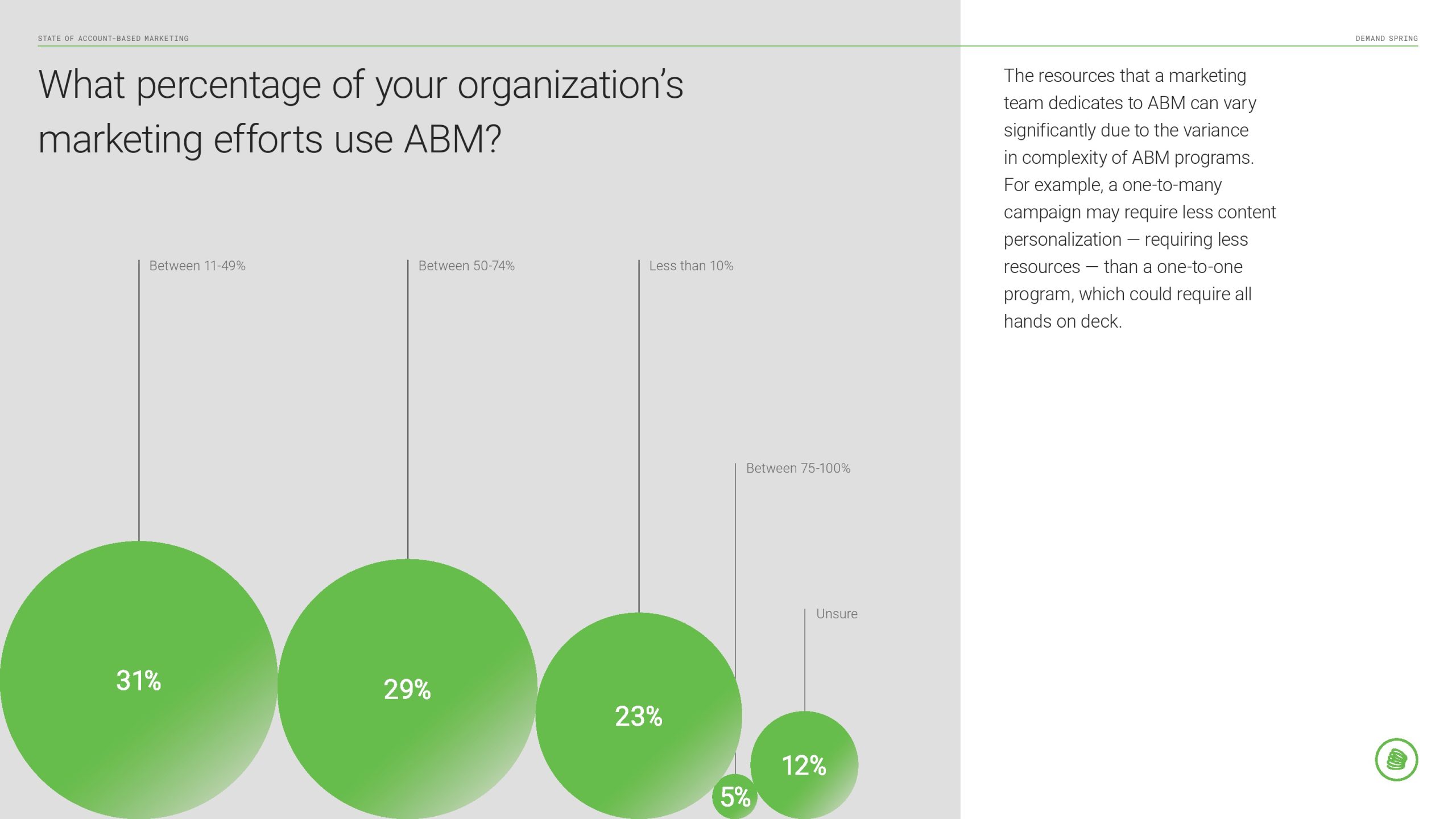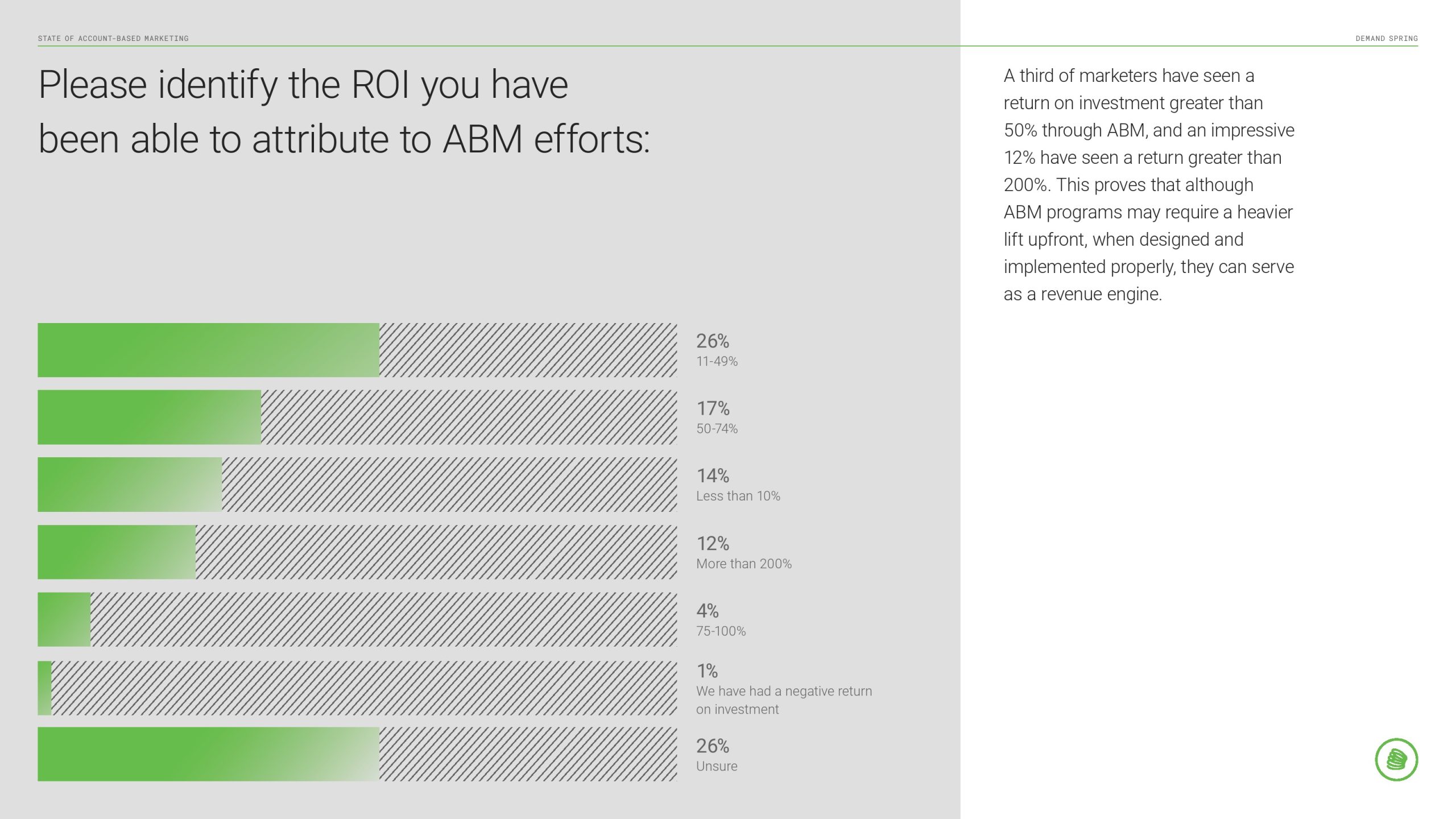在这项最新调查中,虽然约1/4的受访者不确定ABM工作的投资回报率,但超过1/3的营销人员称投资回报率大于50%。