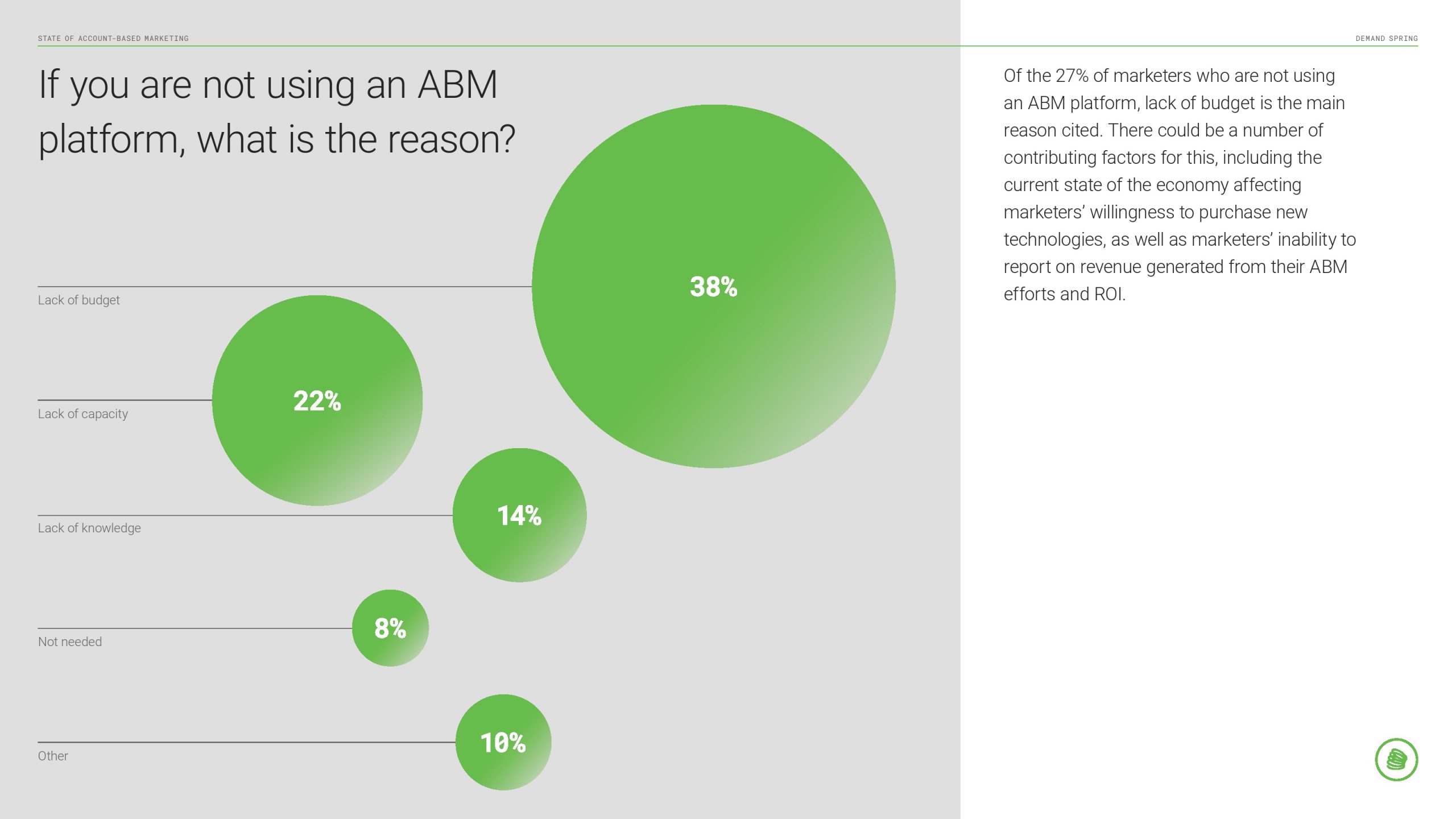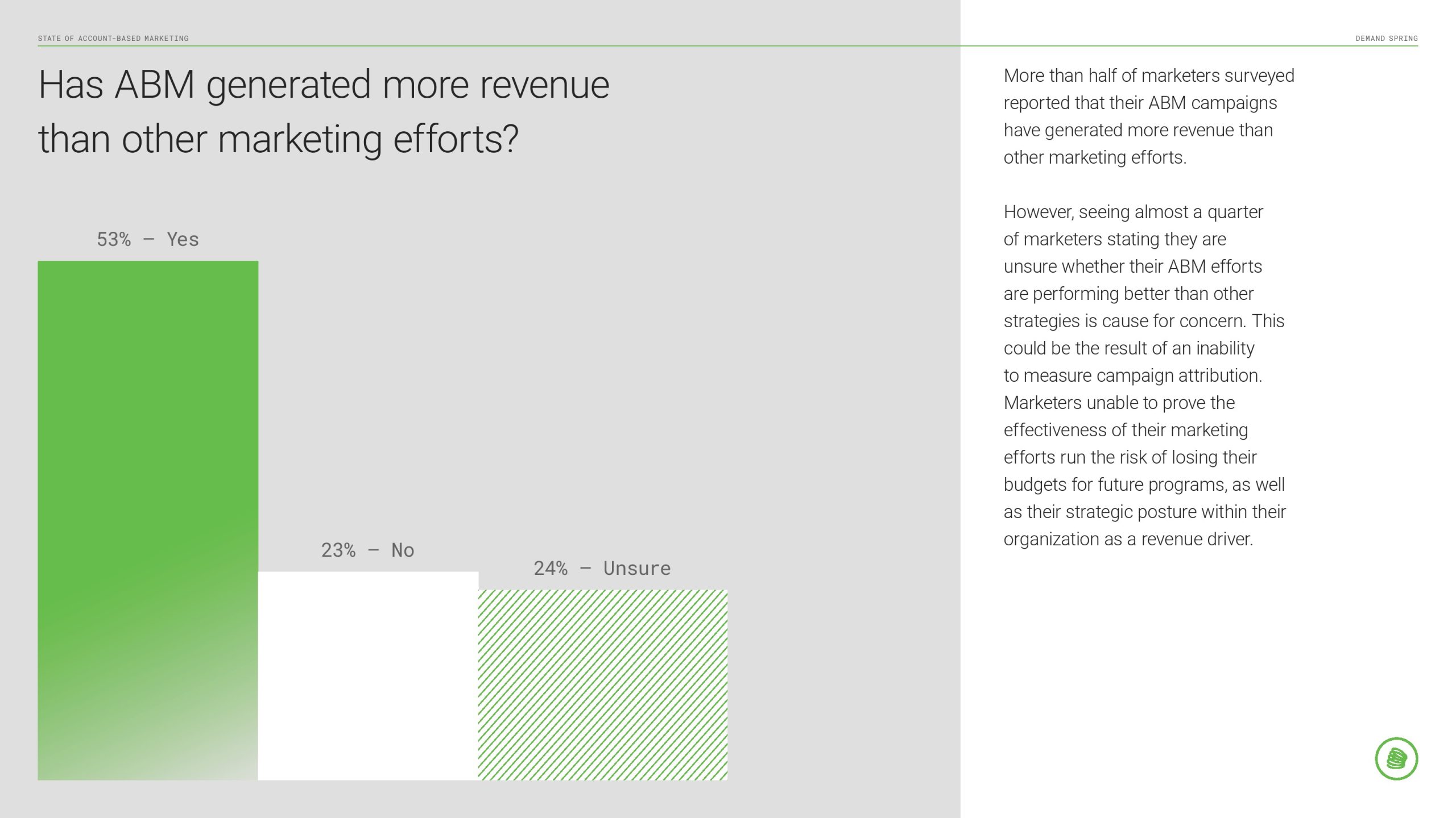 总的来说,略多于一半的受访者(53%)表示ABM比其他营销活动产生了更多的收入;而23%的受访者表示没有;24%的人不确定。早期的研究同样发现,大多数受访者表示ABM的投资回报率高于传统营销,并对收入产生了积极影响。