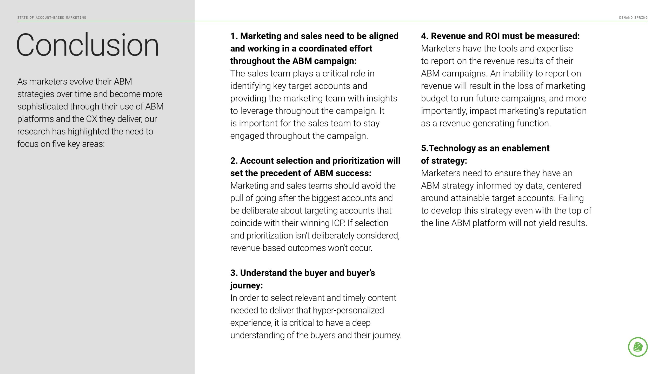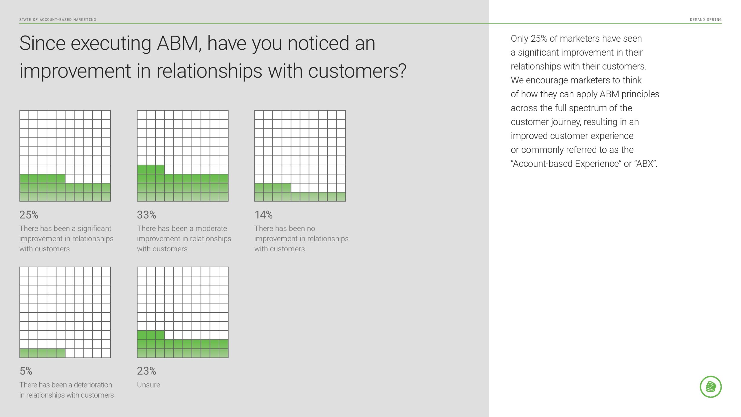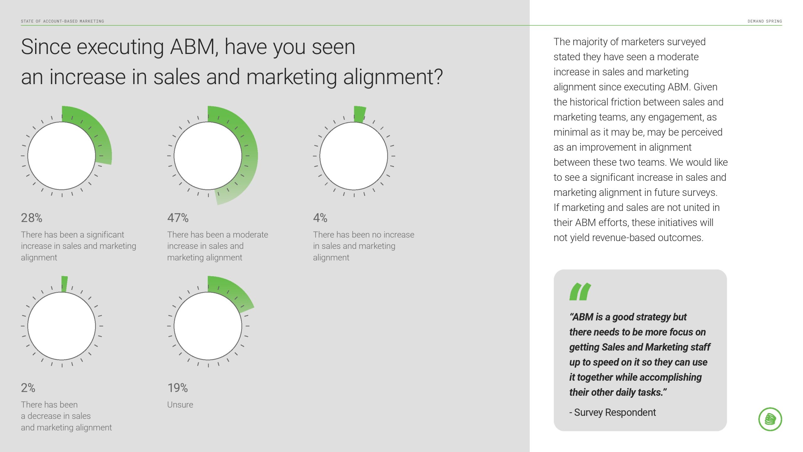 基于账户的营销(ABM)计划带来的最大好处之一是改善销售和营销的一致性。来自Demand Spring的一项新研究证实,自执行ABM以来,许多B2B营销人员正在享受调整的好处。
