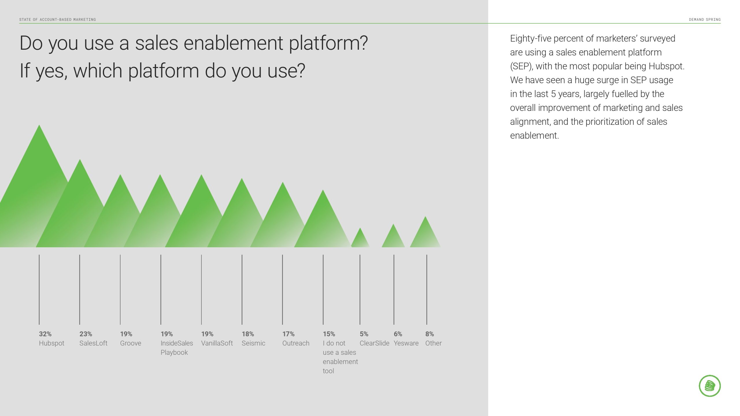 85%的受访者使用销售支持平台,其中Hubspot和SalesLoft最受欢迎。