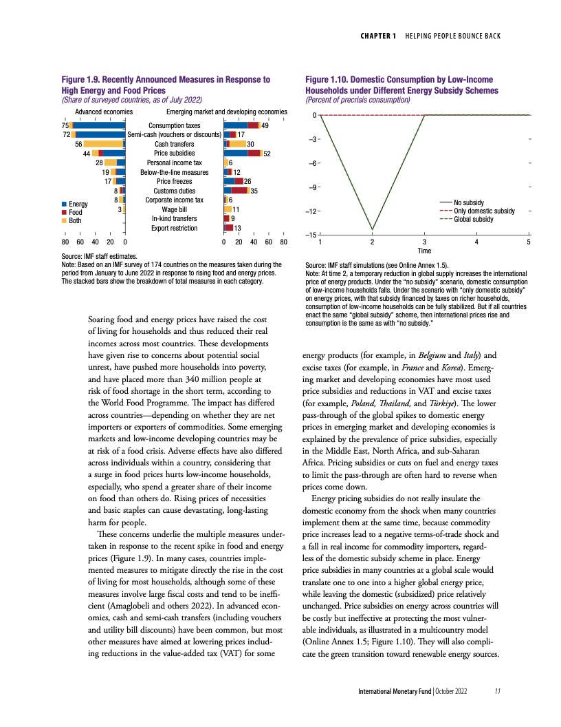 自 2019 年以来,粮食价格上涨了一半,粮食和能源市场的供给扰动持续存在。价格高企威胁着各地民众的生活水平,促使各国政府采取价格补贴、减税和现金转移支付等各种财政措施。根据我们的估计,在有估计值可得的国家中,这些措施(不包括先前已经存在的相关补贴)的财政成本中位数达到了 GDP 的0.6%。