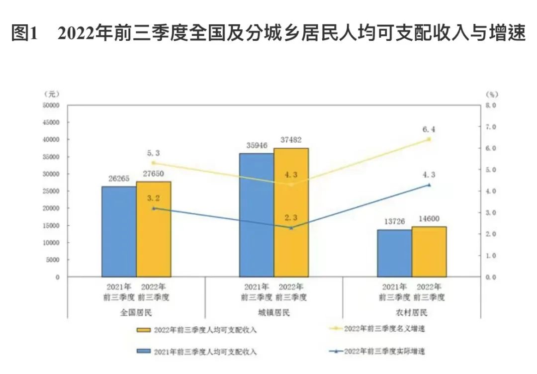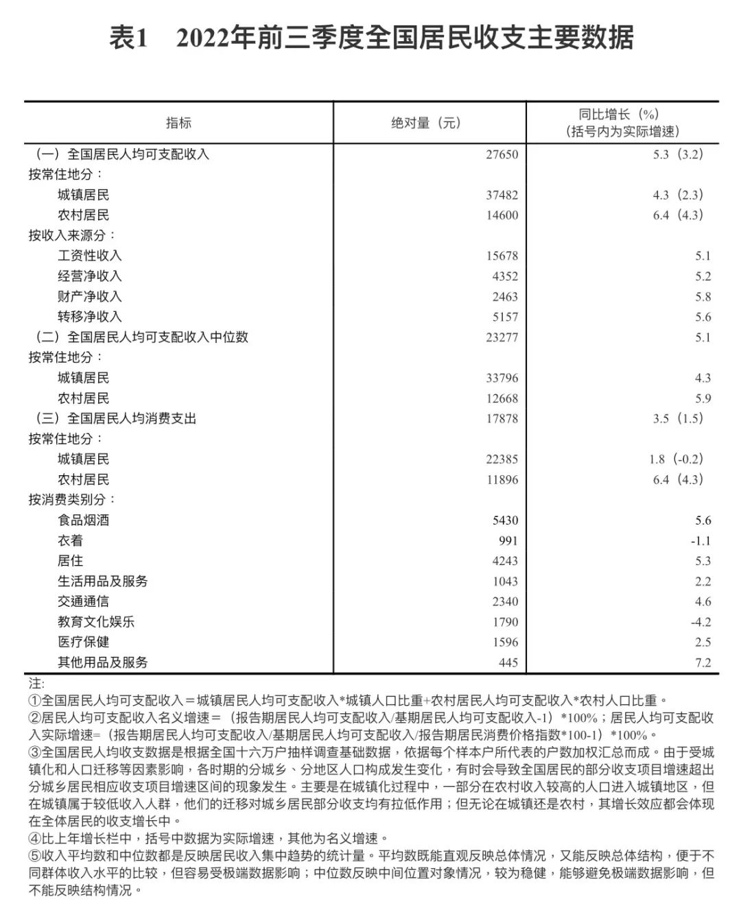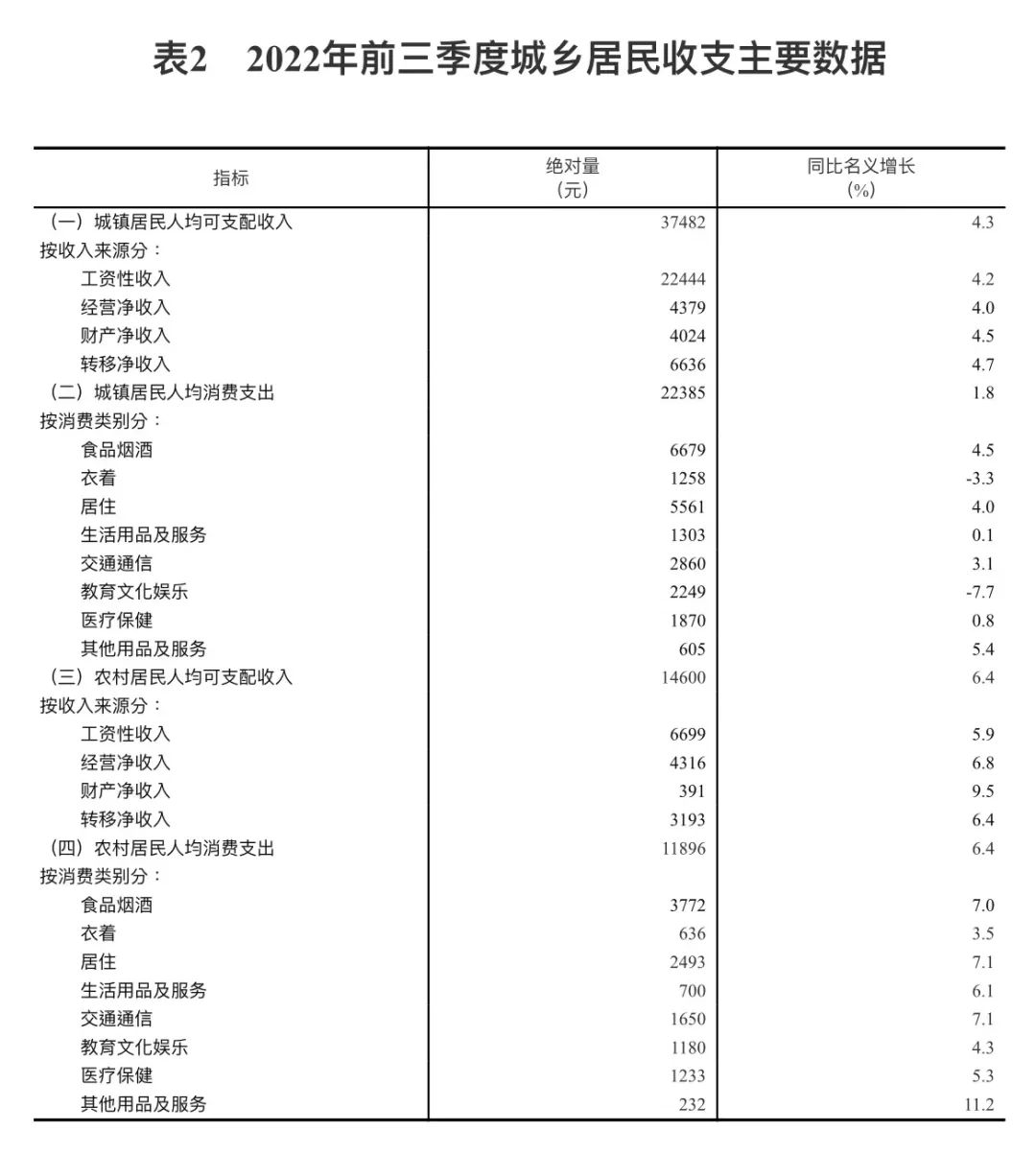 前三季度,全国居民人均可支配收入 27650 元,比上年同期名义增长 5.3%,扣除价格因素,实际增长 3.2%。分城乡看,城镇居民人均可支配收入 37482 元,增长(以下如无特别说明,均为同比名义增长)4.3%,扣除价格因素,实际增长 2.3%;农村居民人均可支配收入 14600 元,增长 6.4%,扣除价格因素,实际增长 4.3%。