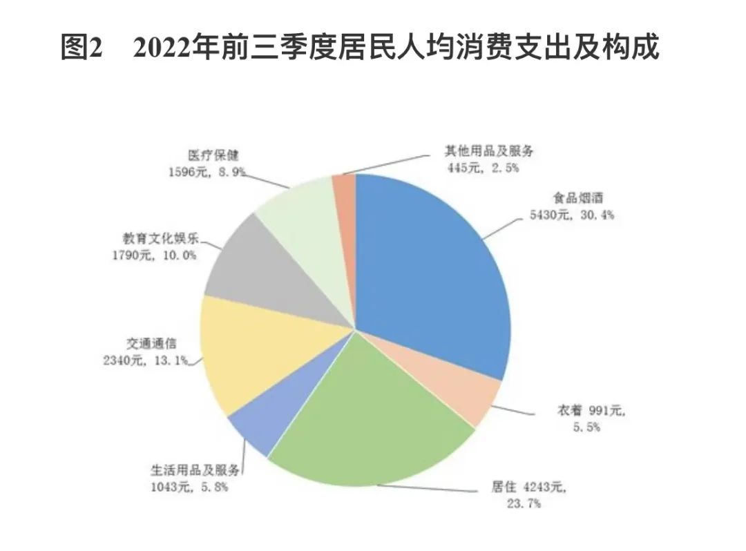 前三季度,全国居民人均食品烟酒消费支出 5430 元,增长 5.6%,占人均消费支出的比重为 30.4%;人均衣着消费支出 991 元,下降 1.1%,占人均消费支出的比重为 5.5%;人均居住消费支出 4243 元,增长 5.3%,占人均消费支出的比重为 23.7%;人均生活用品及服务消费支出 1043 元,增长 2.2%,占人均消费支出的比重为 5.8%;人均交通通信消费支出 2340 元,增长 4.6%,占人均消费支出的比重为 13.1%;人均教育文化娱乐消费支出 1790 元,下降 4.2%,占人均消费支出的比重为 10.0%;人均医疗保健消费支出 1596 元,增长 2.5%,占人均消费支出的比重为 8.9%;人均其他用品及服务消费支出 445 元,增长 7.2%,占人均消费支出的比重为 2.5%。