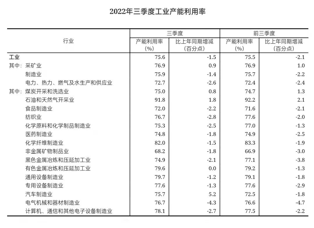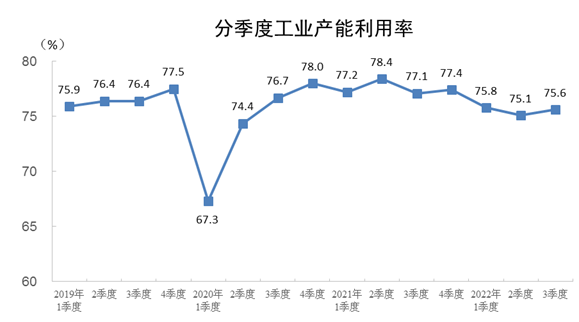 三季度,全国工业产能利用率为 75.6%,比上年同期下降 1.5 个百分点,比上季度回升 0.5 个百分点。