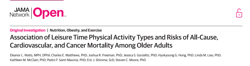 近日,一篇发表在JAMA Network Open 杂志上的文章给出了答案:通过分析27万余名受试者日常运动类型数据发现,与不运动者相比,老年人每周运动7.5-15个MET小时与全因死亡率降低13%显著相关,球类运动、跑步、步行锻炼、其他有氧运动、高尔夫、游泳和骑车分别与全因死亡风险降低16%、15%、9%、7%、7%、5%、3%相关[2]。(谁家附近的公园没有两个把“国球乒乓”打的出神入化的大爷,怪不得大爷们个个都精神矍铄,“国球”优点又多了一个~)