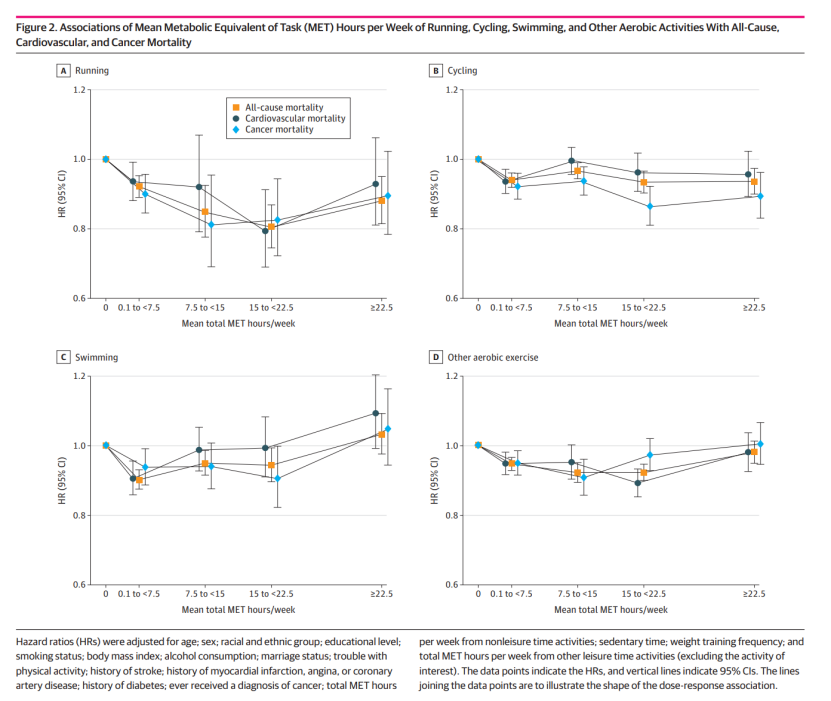 但!敲响警钟的是,对于跑步、游泳和选择有氧课程等其他类型有氧活动的人来说,每周运动超过22.5MET小时,却与死亡风险陡然增高相关!(又为自己的适度“躺平”找到了理由)