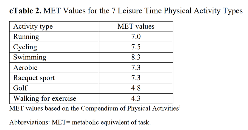 研究人员应用调查问卷收集统计所有受试者每周运动的平均时长(共10个可选项:无、5min、15min、30min、1h、1.5h、2-3h、4-6h、7-10h、超过10h)。不同运动的MET值[3]乘以受试者每周运动平均时间代表受试者每周运动强度。问卷同时收集了受试者的身高、体重、吸烟史、是否存在抑郁或活动障碍等情况。