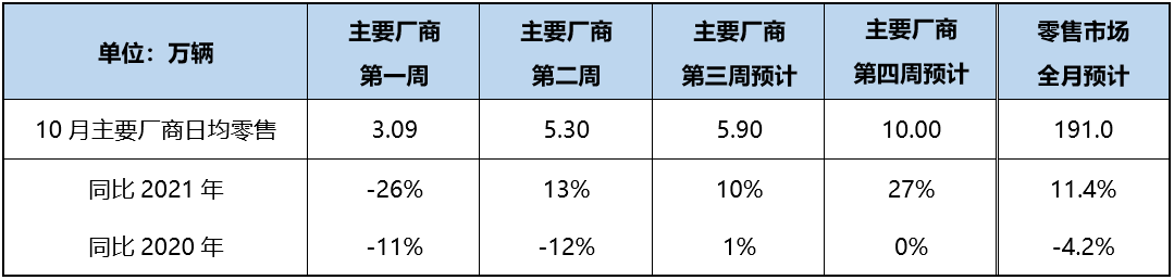 10 月初,疫情感染人数再度上升,假期出行和消费表现不及往年,主要厂商零售第一、二周的日均同比分别为 – 26%、13%。在 “动态清零” 抗疫总方针下,各地快速发现、快速处置,感染人数有效下降,预计第三周市场稳步攀升,同比 10% 左右。考虑到多个秋季车展将在 10 月底复展,购置税等促消费政策到期前厂商加紧完成年度销售任务,第四周进入月末冲量阶段,由于去年同期受芯片短缺影响基数较低,预计日均零售同比将达到 27% 左右。综合估算 10 月零售将达到 191.0 万辆。