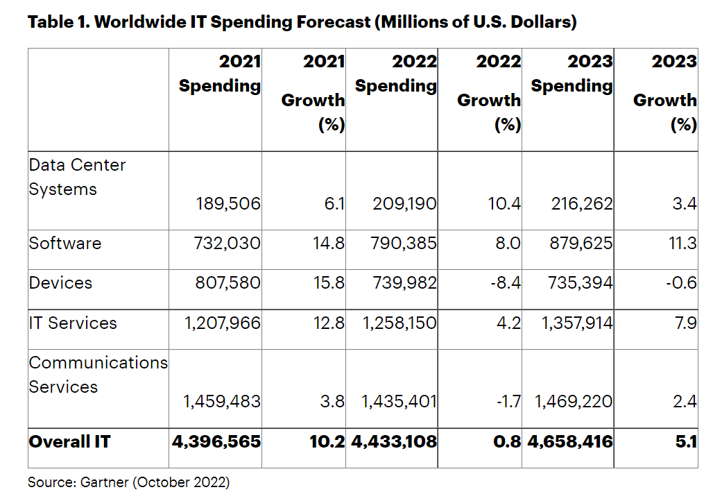 根据Gartner的最新预测,2023年全球IT支出预计将达到4.6万亿美元,比2022年增长5.1%。企业推动数字业务计划以应对经济动荡,2023的IT需求预计将更加强劲。