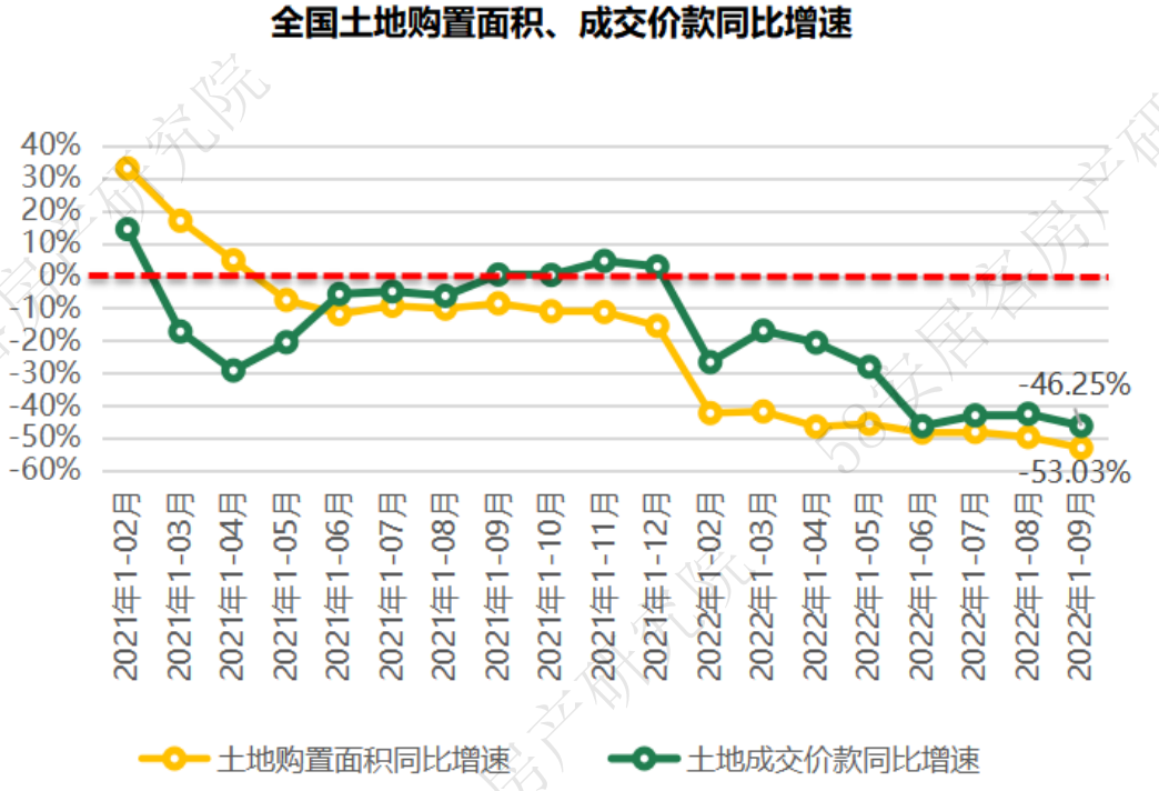 2022年1-8月份,全国土地购置面积仅为6449万平米,同比下滑幅度接超50%,较上个月继续扩大,土地购置面积的同比跌幅今年以来持续在4成以上。1-9月土地成交价款为5024亿元,同比跌幅46%,跌幅较上月也有扩大。但从单月角度看,9月土地购置面积1049万平米,是今年第二个破千万方的月份,相较上个月提升22.8%,单月成交土地价款环比上扬33.7%。