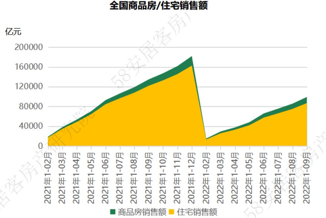 2022年1-9月,全国商品房销售面积101422万平米,同比下滑22%,其中住宅销售面积占到85%,为85758万平米,同比下滑26%。1-9月商品房销售金额为99380亿元,同比降幅26%,住宅销售金额为87054亿元,同比降幅29%,上述数据较上个月均出现了上下小幅波动的态势。但从单月值看,9月商品房销售面积和销售额都较上个月出现大幅提升,其中,住宅销售面积和销售额分别环比上扬37%和31%。