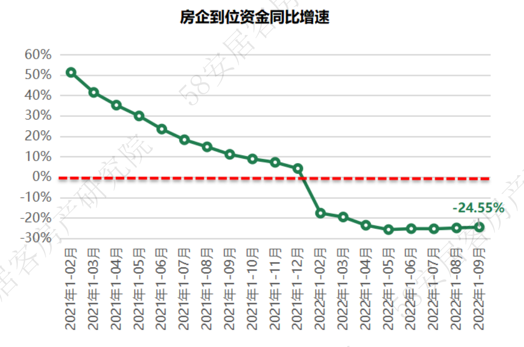 2022年1-9月,全国房企到位资金11.43万亿元,同比降幅25%。从资金来源上看,国内贷款同比降幅27.22%,定金及预收款同比降幅为34.12%,个人按揭贷款同比降幅为23.74%,均较上个月基本持平。从单月值看,9月到位资金环比上扬11.9%,其中国内贷款上扬10.5%,定金预收款和个人按揭贷款分别上扬11.7%和3.9%。