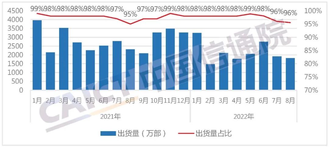 2022年8月,智能手机出货量1813.5万部,同比下降21.4%,占同期手机出货量的95.6%。2022年1-8月,智能手机出货量1.71亿部,同比下降22.9%,占同期手机出货量的97.7%。