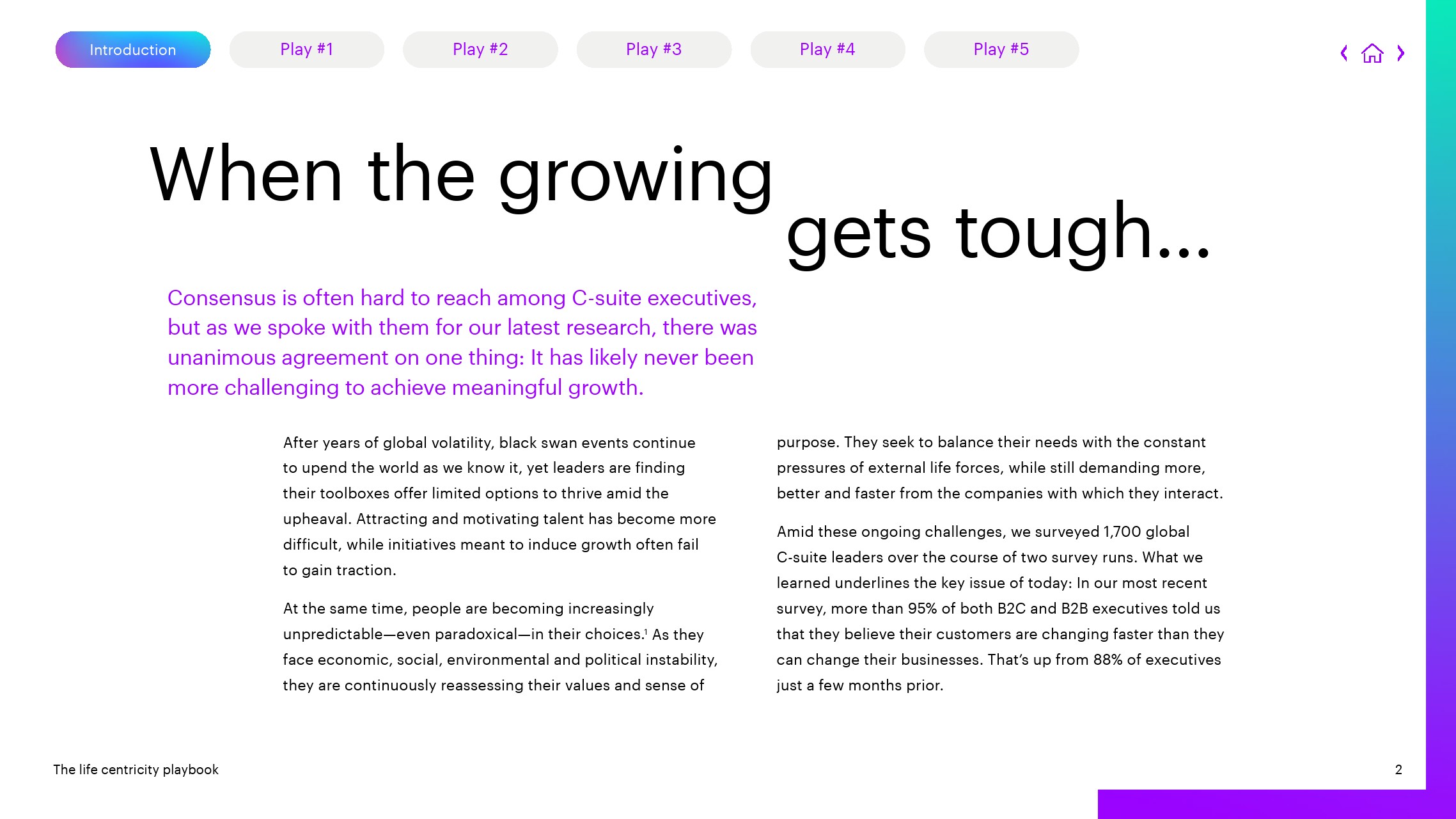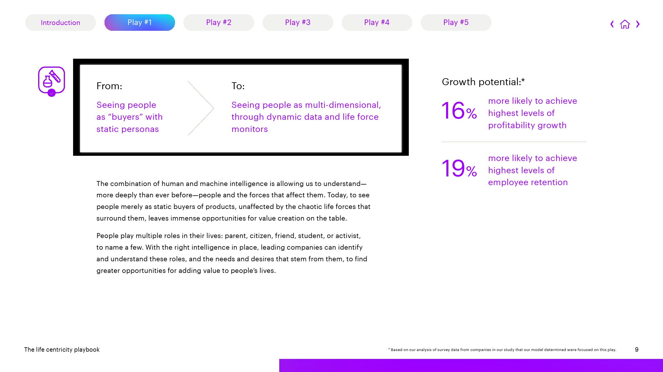 1、深入了解人:高增长的公司利用数据、人类创造力和机器智能更深入地了解人们的多维生活,寻找新的机会来提高价值。研究结果显示,这样做的公司实现最高水平盈利增长的可能性可提高16%,实现最高水平员工留任的可能性提高19%。