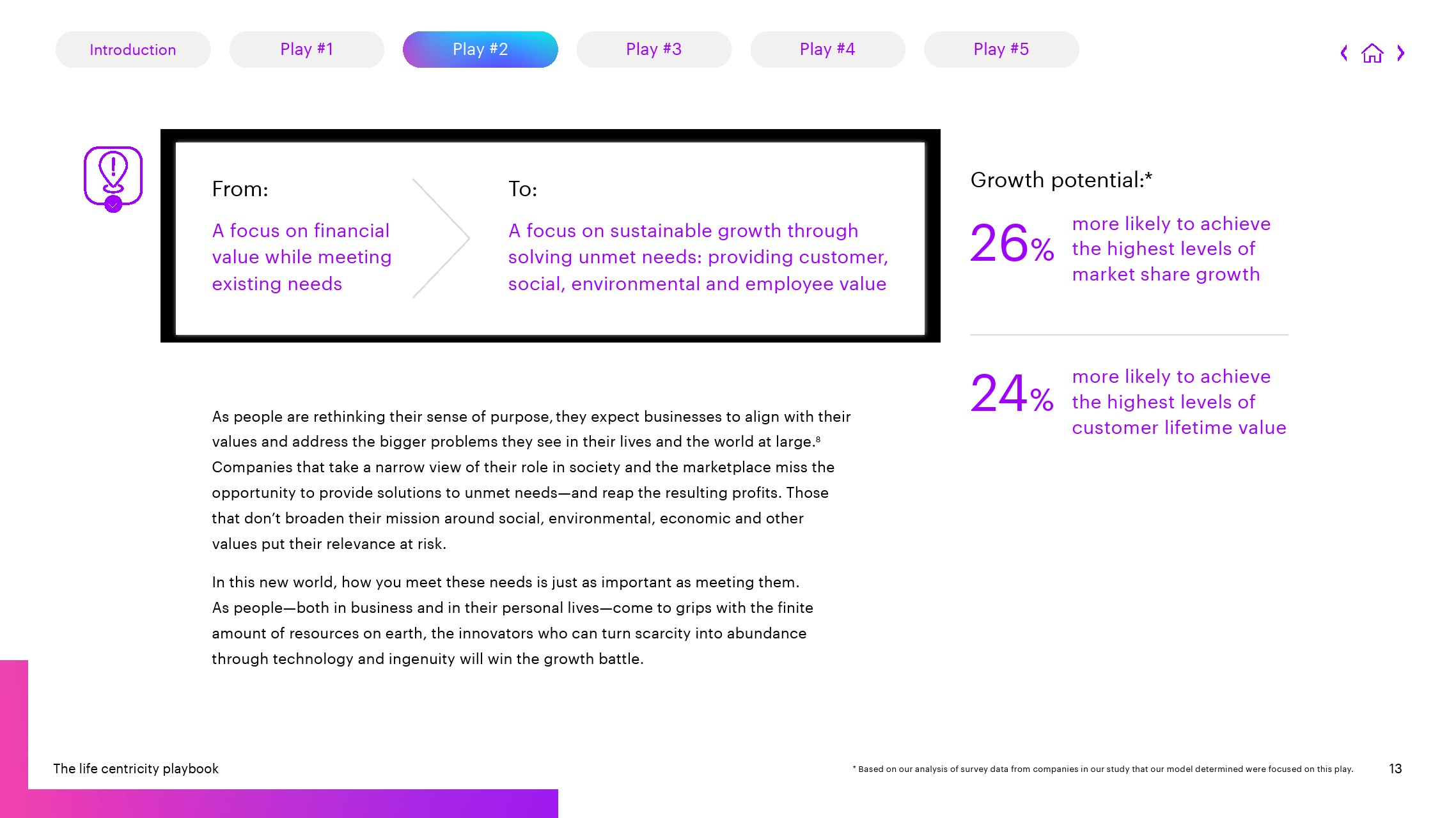 2、扩大价值创造的范围:通过提供客户、社会、环境和员工价值来关注可持续增长的公司实现最高市场份额增长的可能性提高26%,实现最高客户终身价值的可能性提高24%。