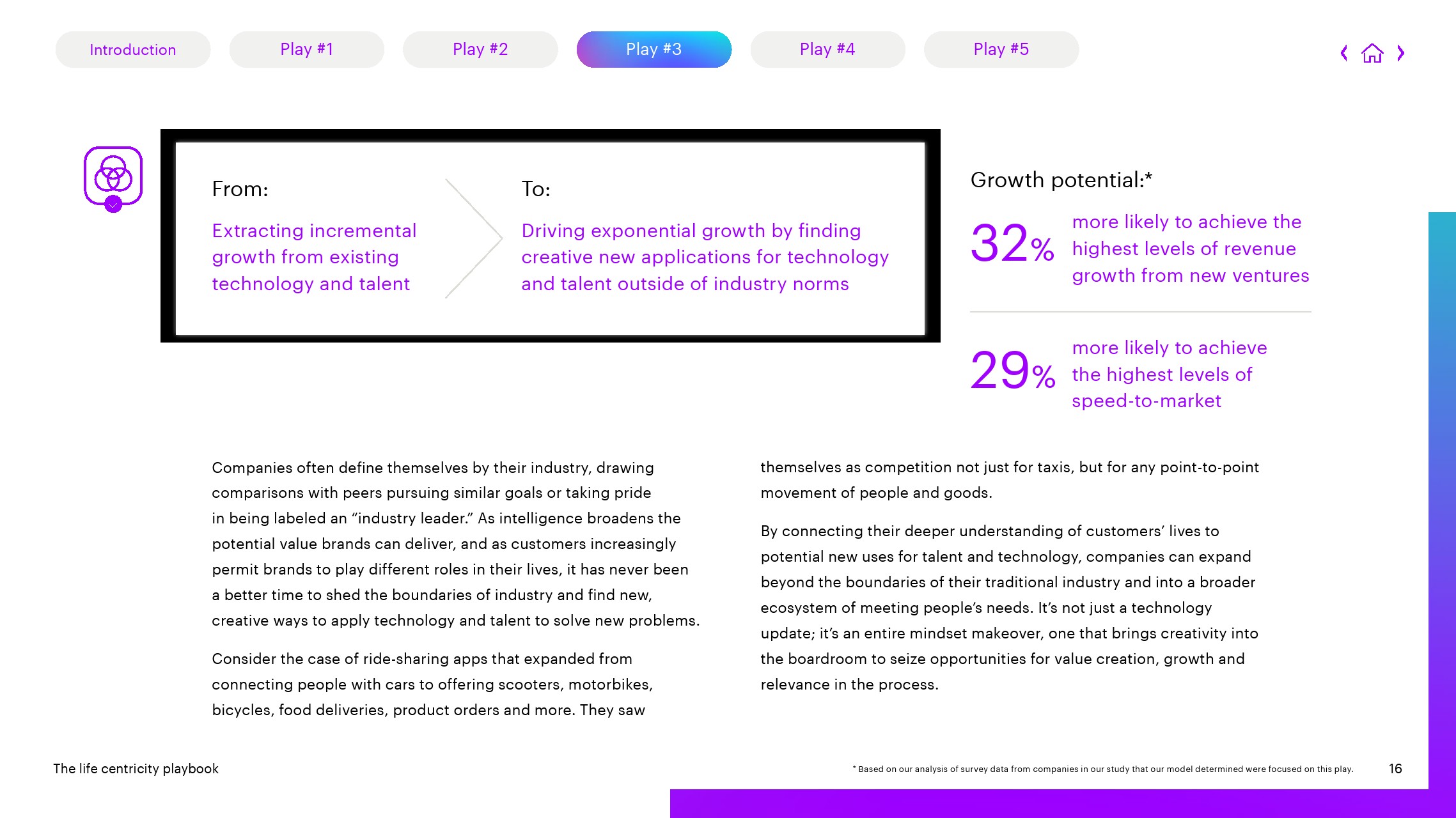 3、创造性地超越行业规范:报告还发现,在新的环境中创造性地应用技术和人才的公司超越了行业结构,进入了更广泛的满足人们需求的生态系统,获得最高收入增长的可能性提高32%,实现最高上市速度的可能性提高29%。