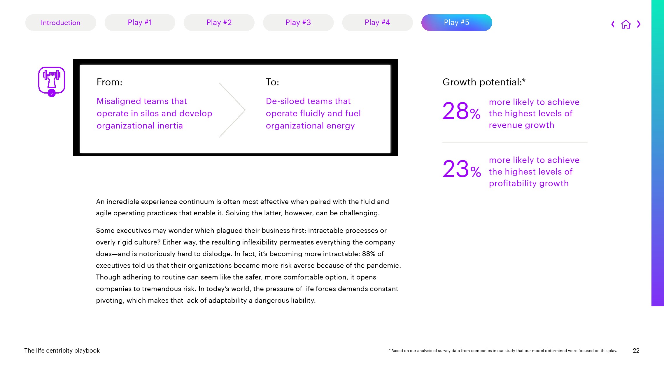 5、构建跨职能的流动运营:报告还发现,使用人力和机器团队来赋能人才、统一工作流和平台,以及设计敏捷的公司实现最高收入增长的可能性提高28%,实现最高盈利增长的可能性提高23%。