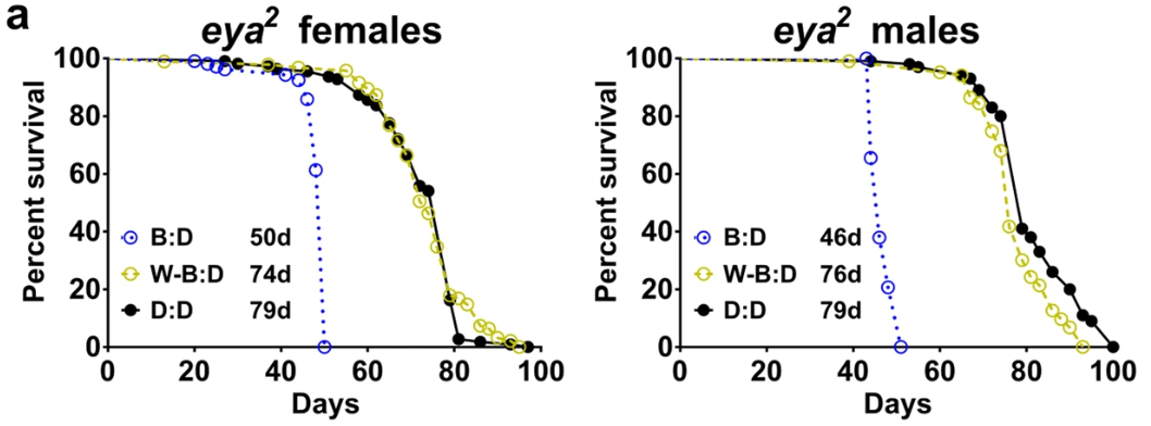 不仅如此,长时间的蓝光暴露使得果蝇的睡眠和昼夜节律紊乱,体内应激保护基因会在光照条件下进行高表达,大大缩短了果蝇的寿命,加速其衰老。并且以上蓝光伤害并不会因为果蝇视觉受损、无法感光而 “高抬贵手”。