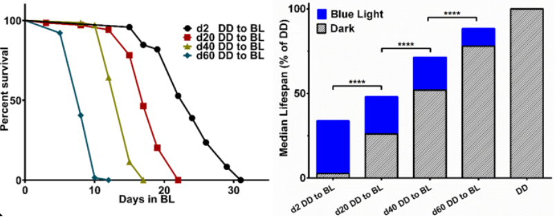 在这项研究中,果蝇幼虫先被安置于黑暗环境中饲养一段时间(分别为 2 天;20 天;40 天;60 天),随后转移至由 LED 灯创造的恒定蓝光环境中生活以接受研究人员的观察。