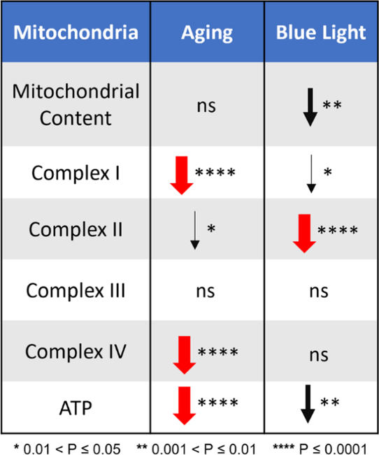 众所周知,线粒体被誉为细胞的 “发电厂”,它可以产生 ATP 作为能量通货供机体使用。然而当线粒体发生损耗活力下降时,会使细胞可用的能量越来越少,细胞不再“蓬勃生长”,从而加速老化——这似乎也是果蝇“折寿” 的关键点——研究人员对蓝光下的老年果蝇线粒体活性进行检测,发现线粒体含量和呼吸功能分别受年龄和光照的影响而发生损耗。