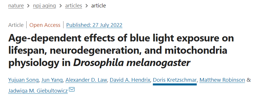 [2] Song, Y., Yang, J., Law, A.D. et al. Age-dependent effects of blue light exposure on lifespan, neurodegeneration, and mitochondria physiology in Drosophila melanogaster. npj Aging 8, 11 (2022). https://doi.org/10.1038/s41514-022-00092-z.