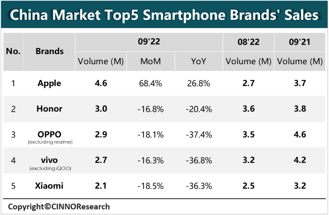 报告指出,9 月苹果以约 460 万部的销量重回国内市场第一,同比增长 26.8%,环比增长 68.4%,环比、同比双增长,Top5 品牌同比和环比唯一正增长,主要得益于苹果新品 iPhone 14 系列上市以及 iPhone 13 持续良好的市场表现。