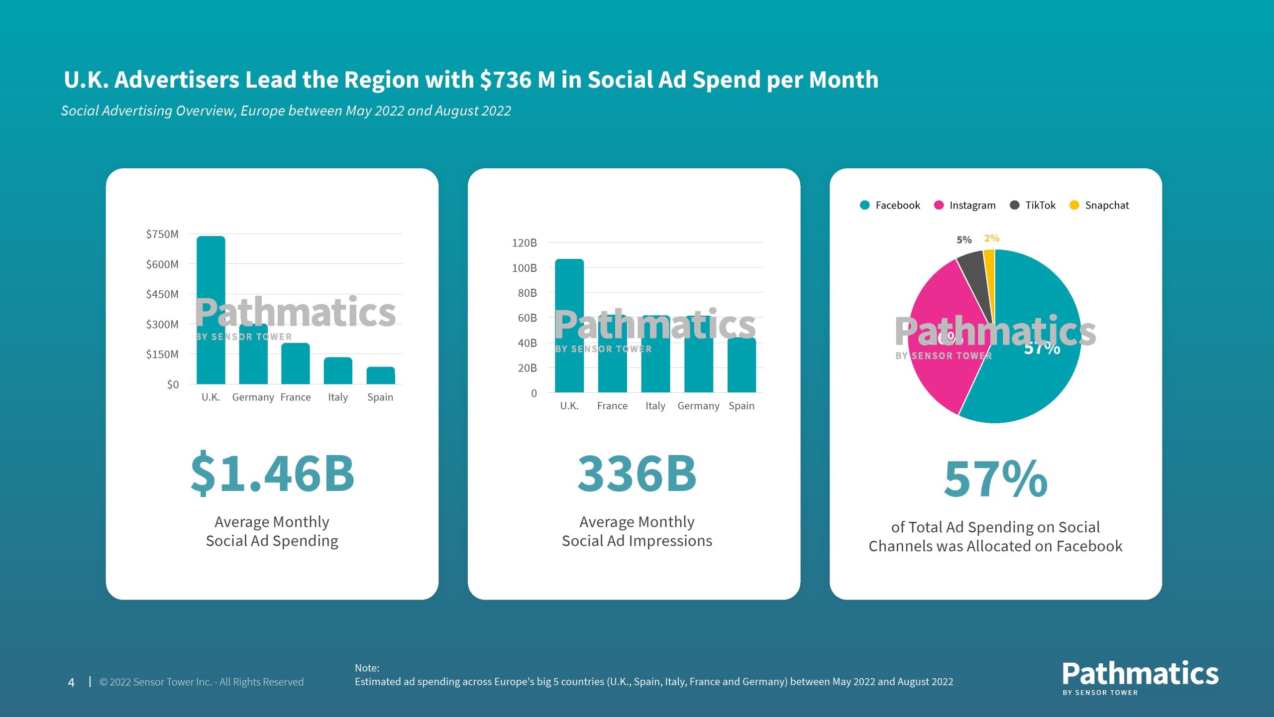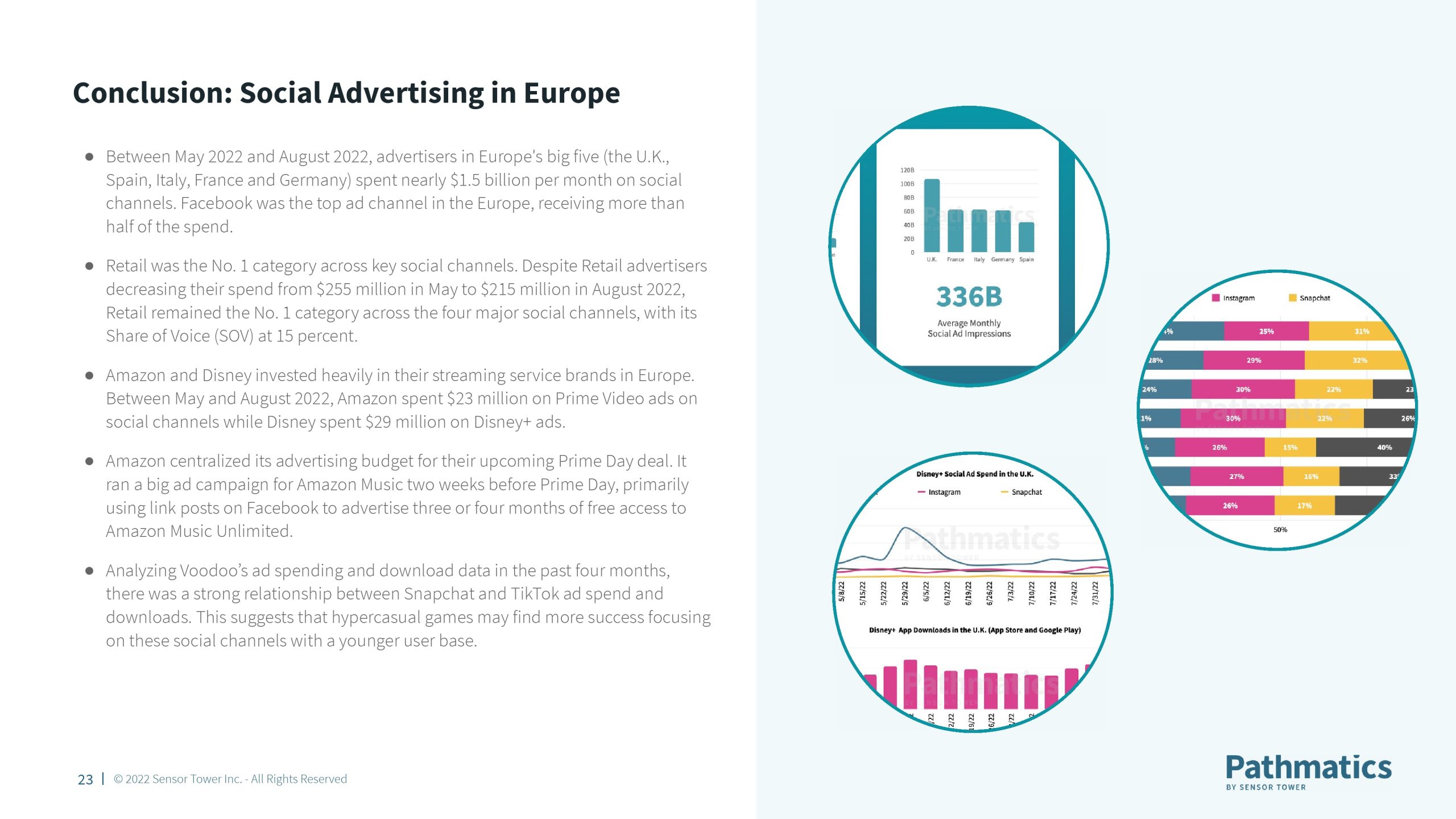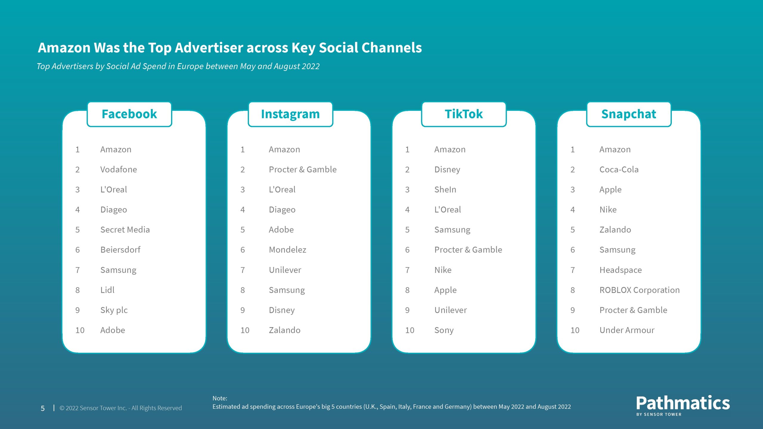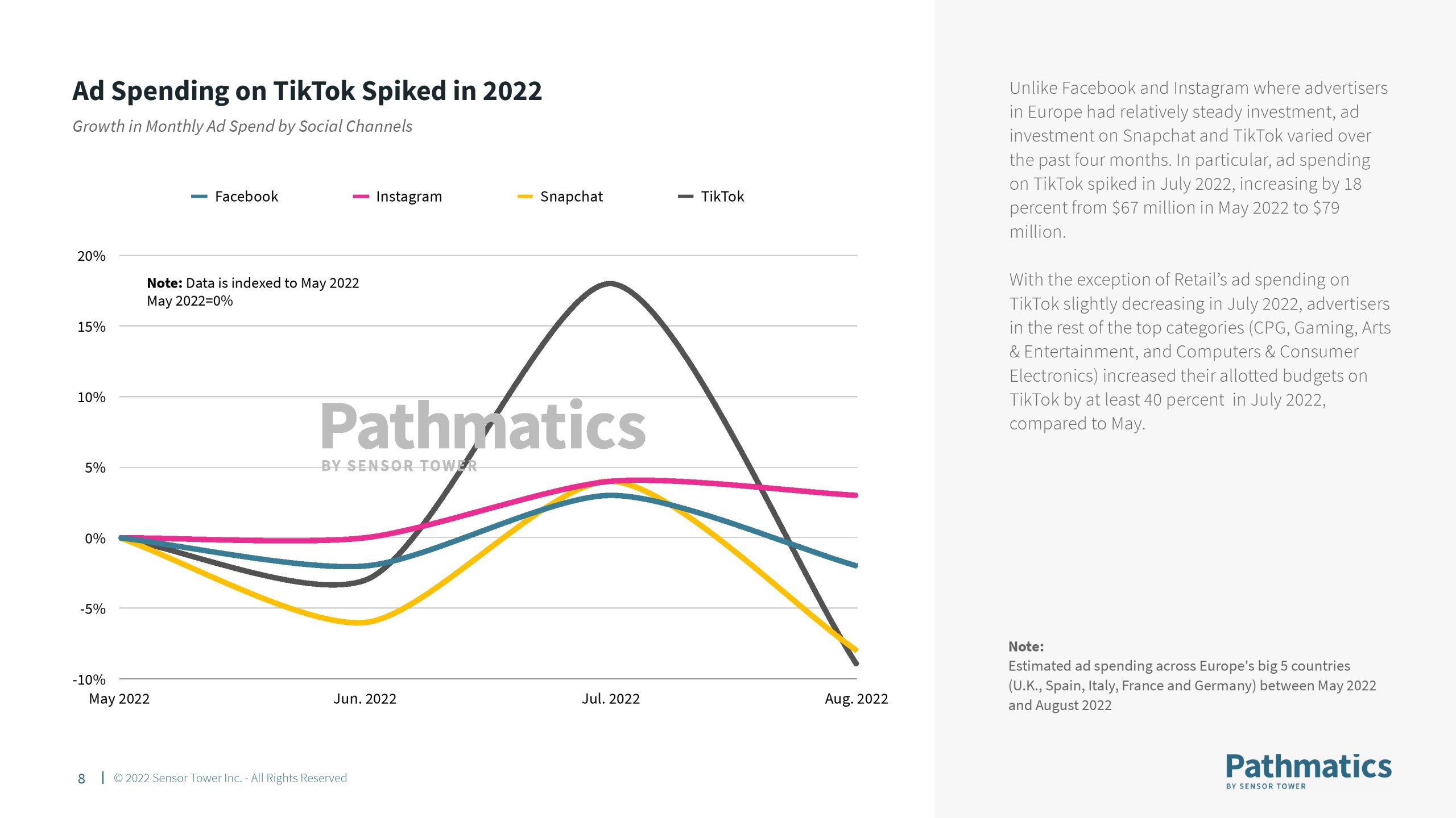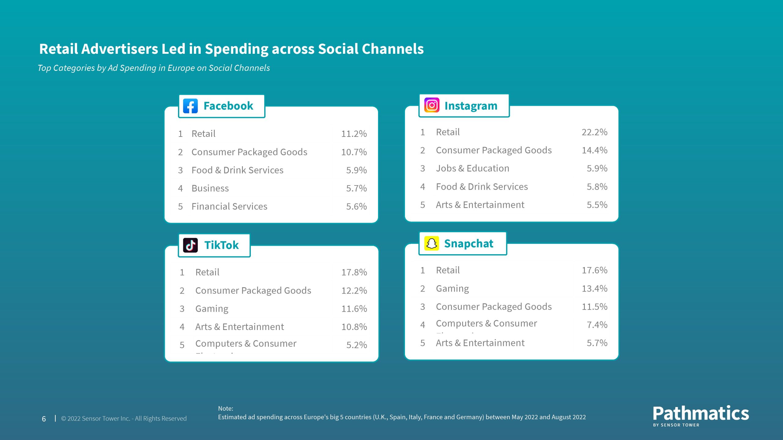根据Pathmatics的数据,2022年5月至8月期间,欧洲五大国(英国、西班牙、意大利、法国和德国)的广告主每月在社交渠道上支出近15亿美元。