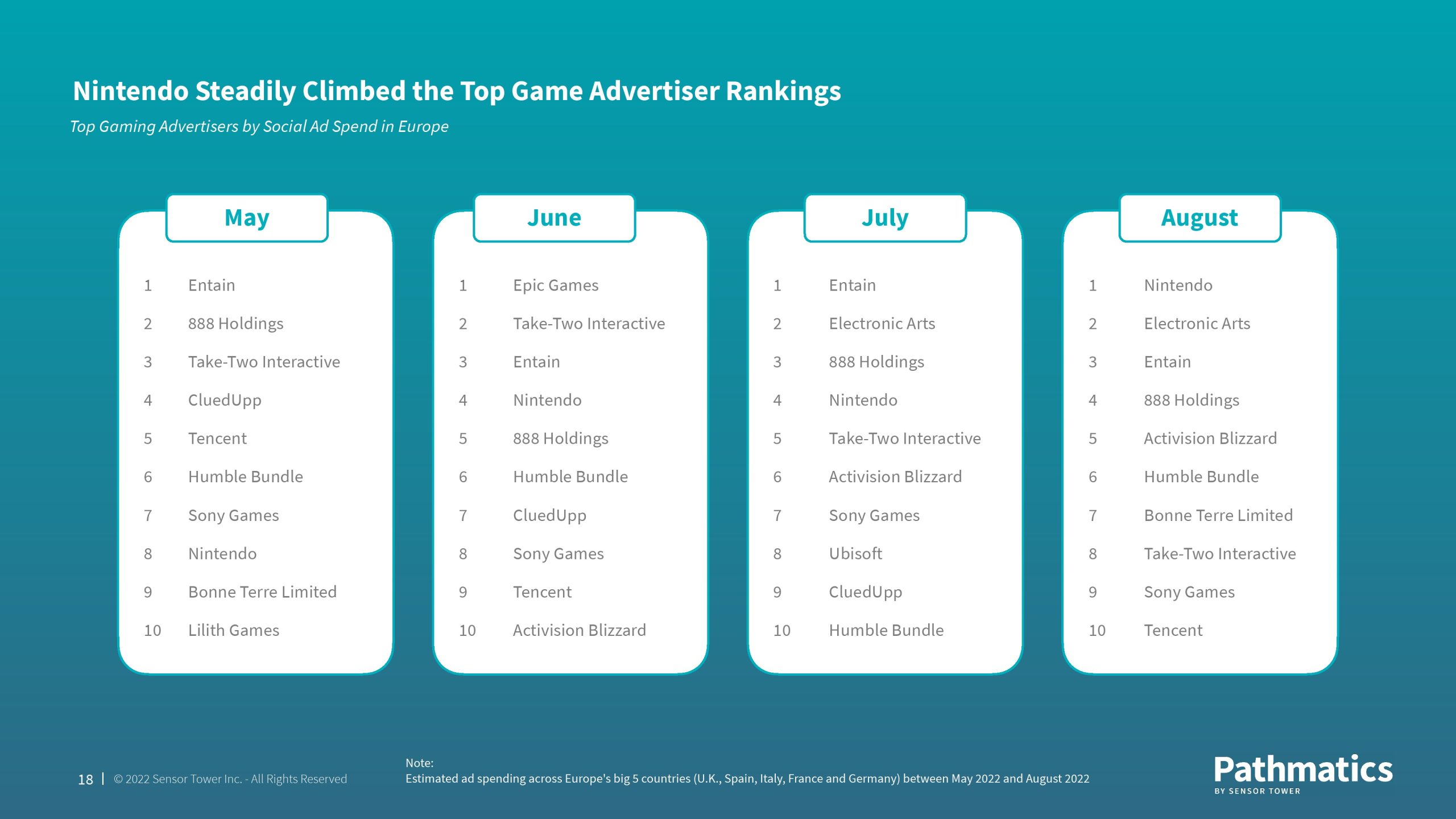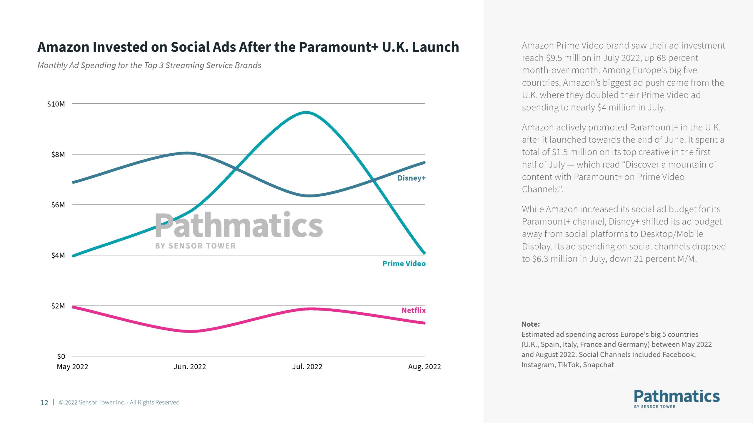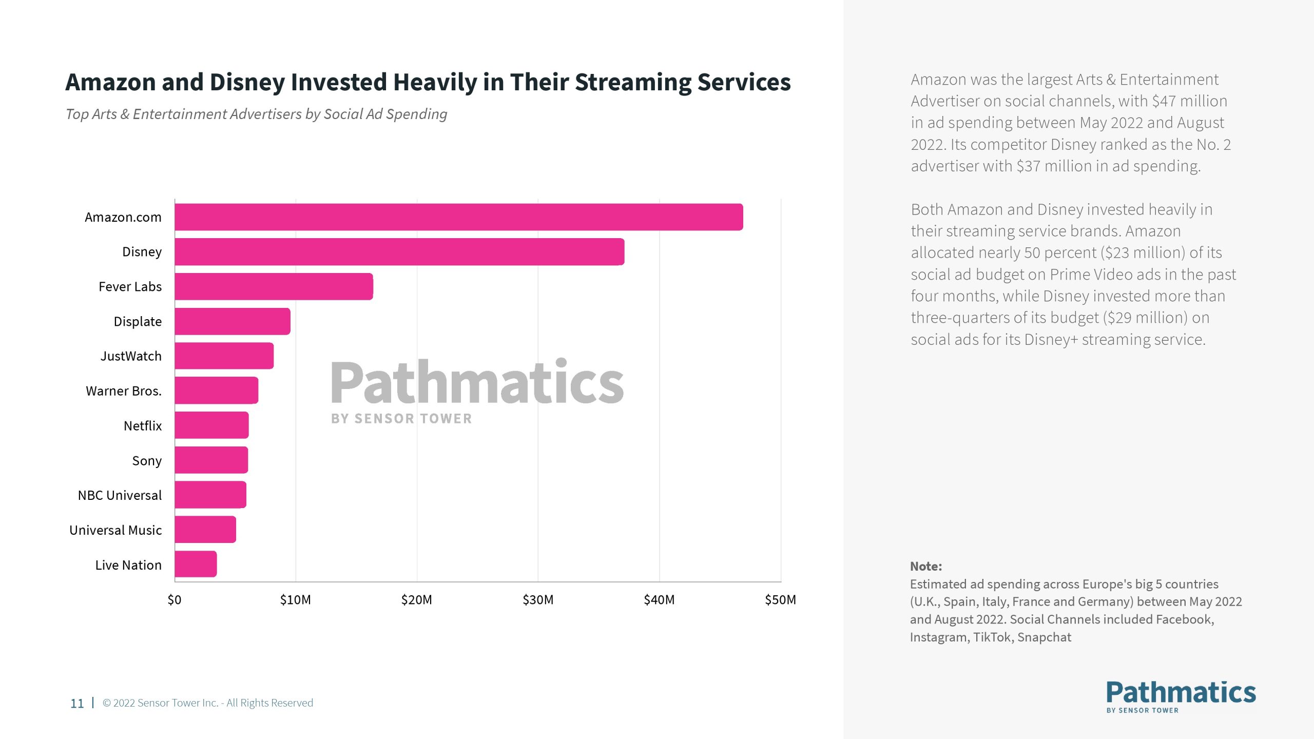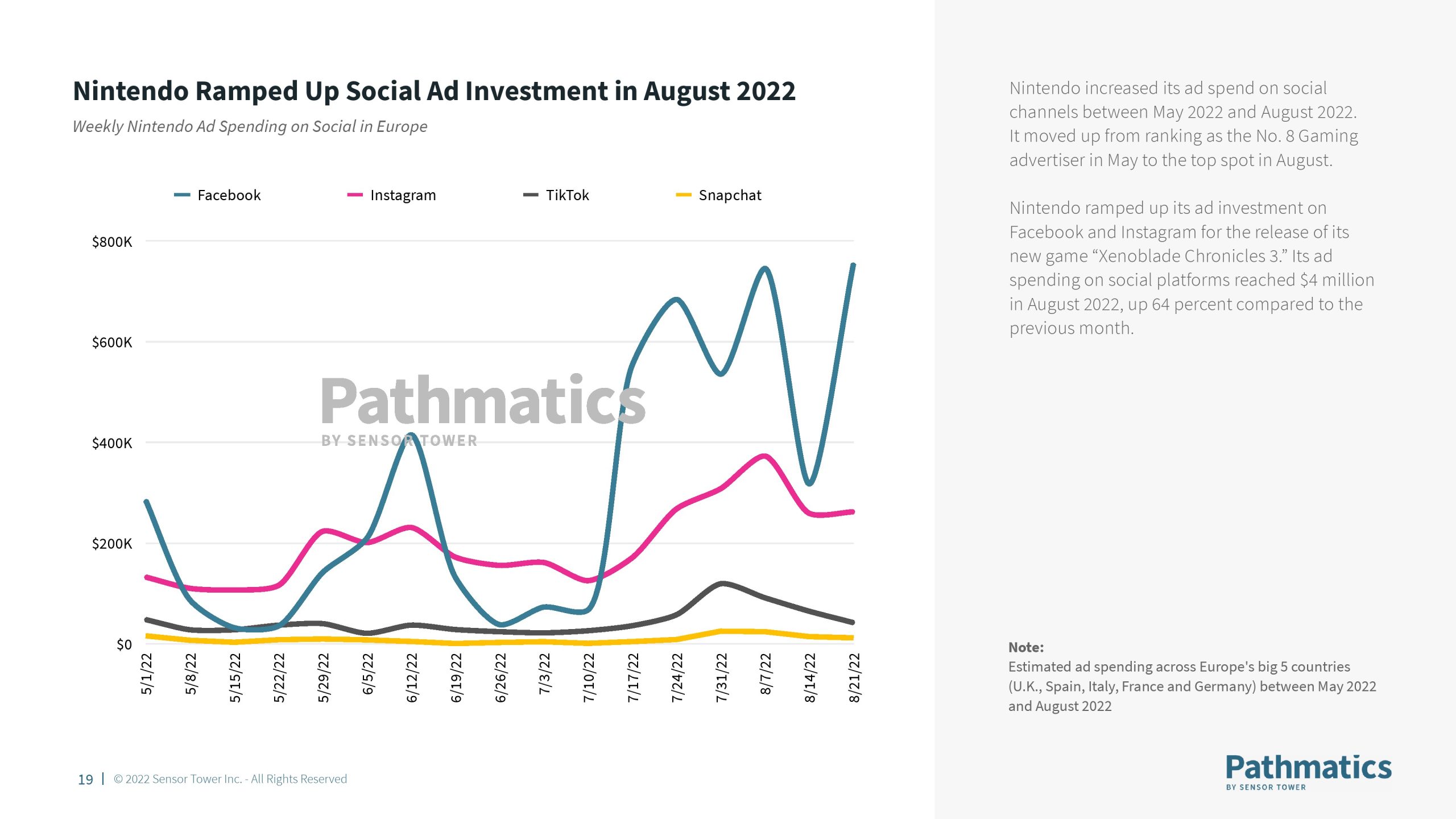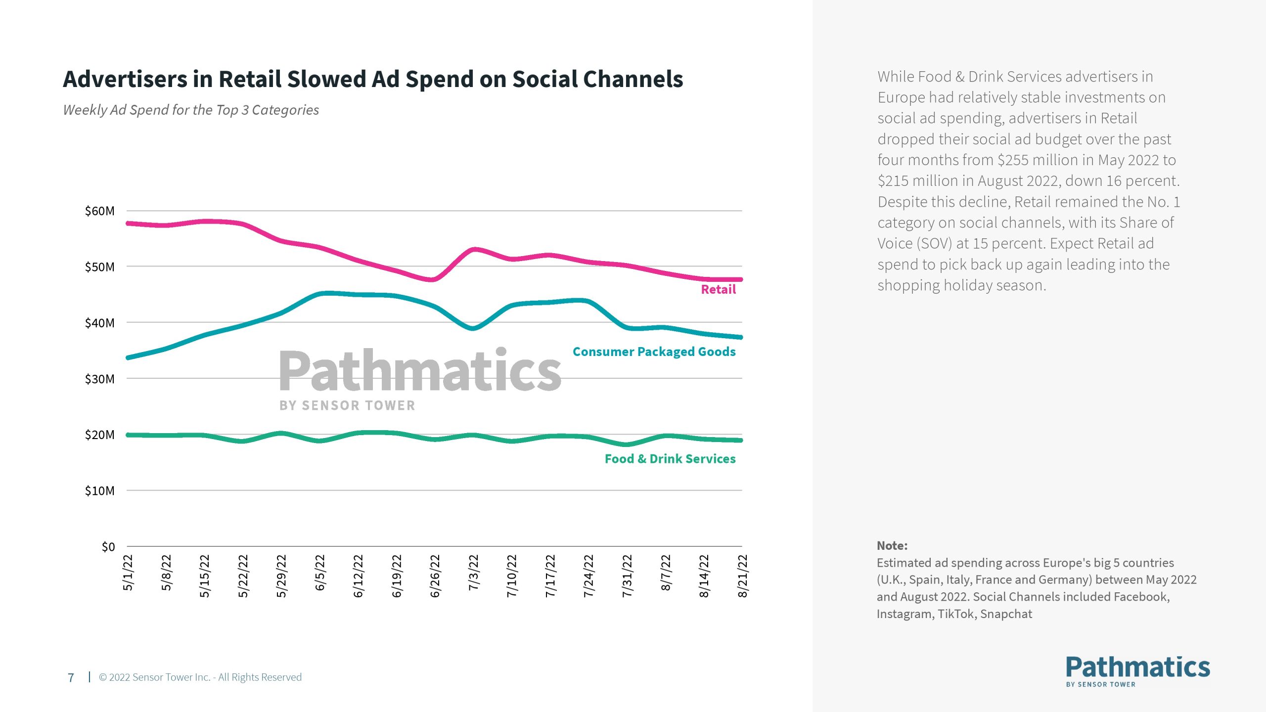 根据Pathmatics的数据,2022年5月至8月期间,欧洲五大国(英国、西班牙、意大利、法国和德国)的广告主每月在社交渠道上支出近15亿美元。