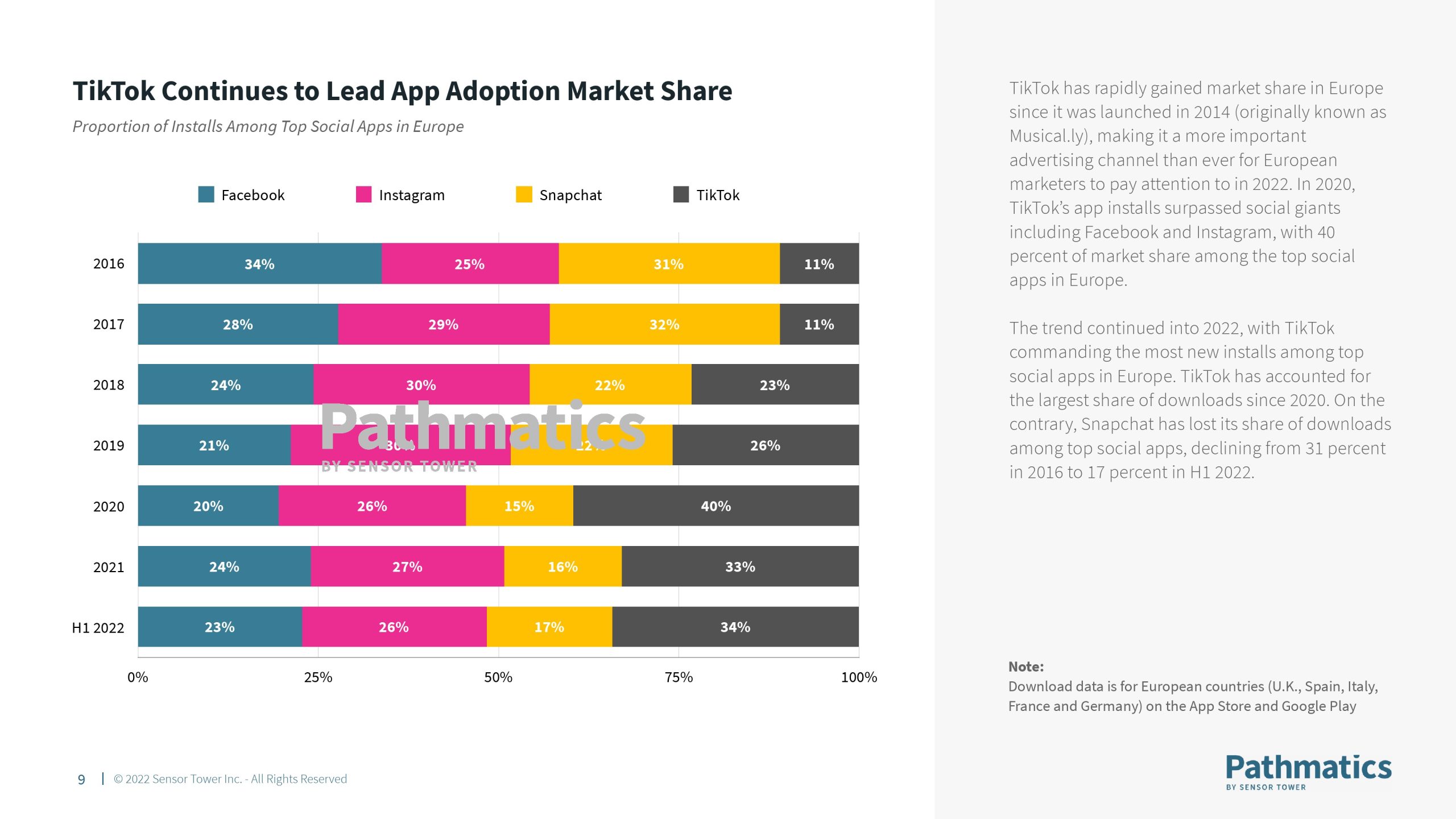 随着欧洲娱乐和游戏行业的广告主在2022年上半年从Snapchat和TikTok等渠道中受益,更多公司可能会继续将广告预算投资于TikTok等渠道,这已被证明是促进应用下载的有效渠道。