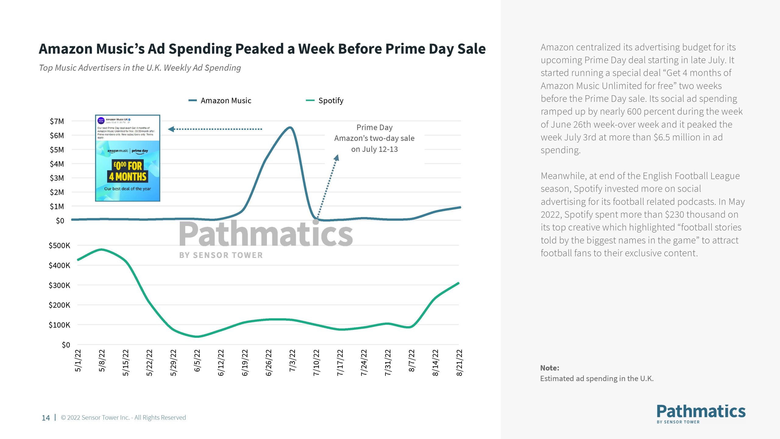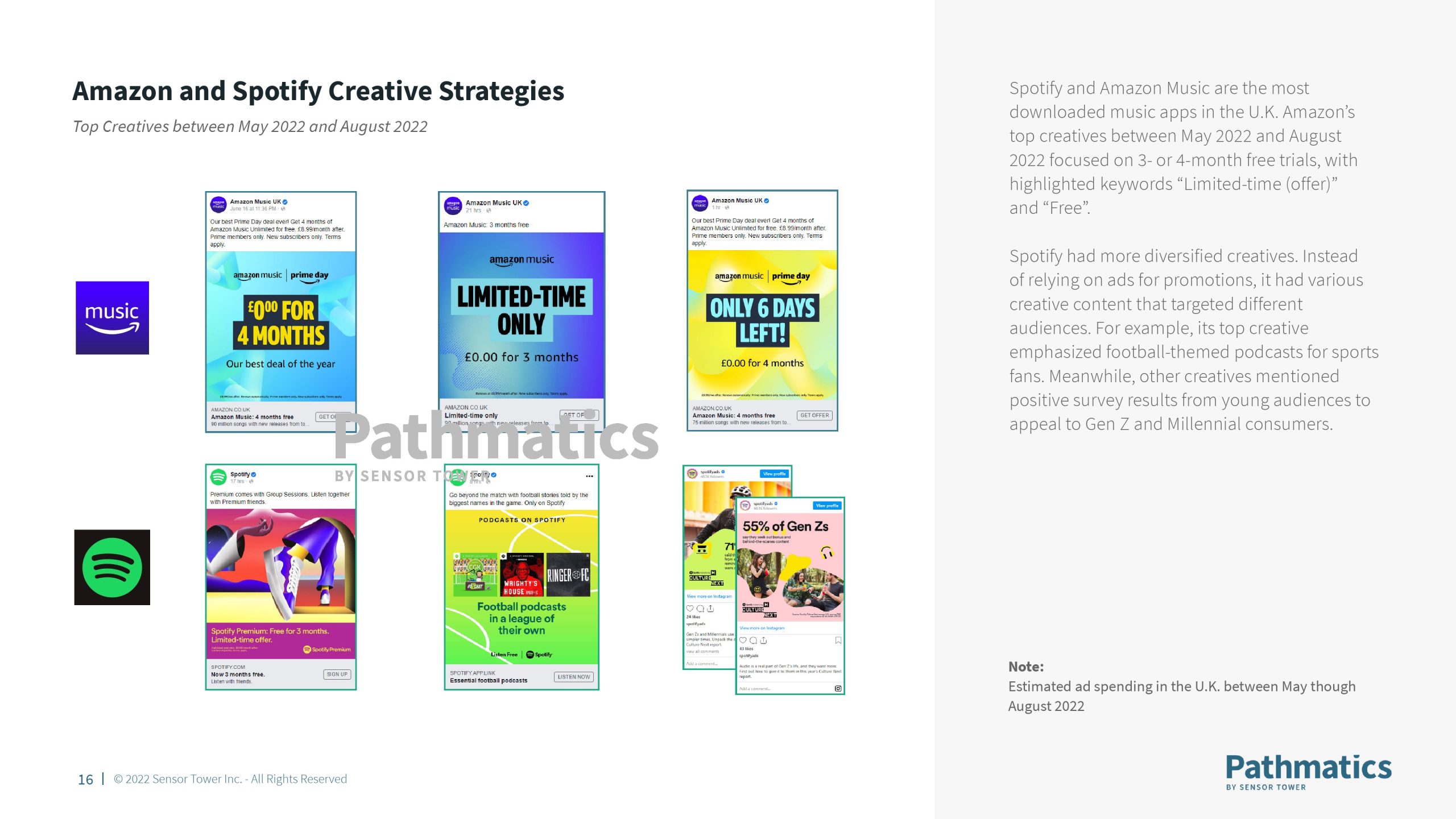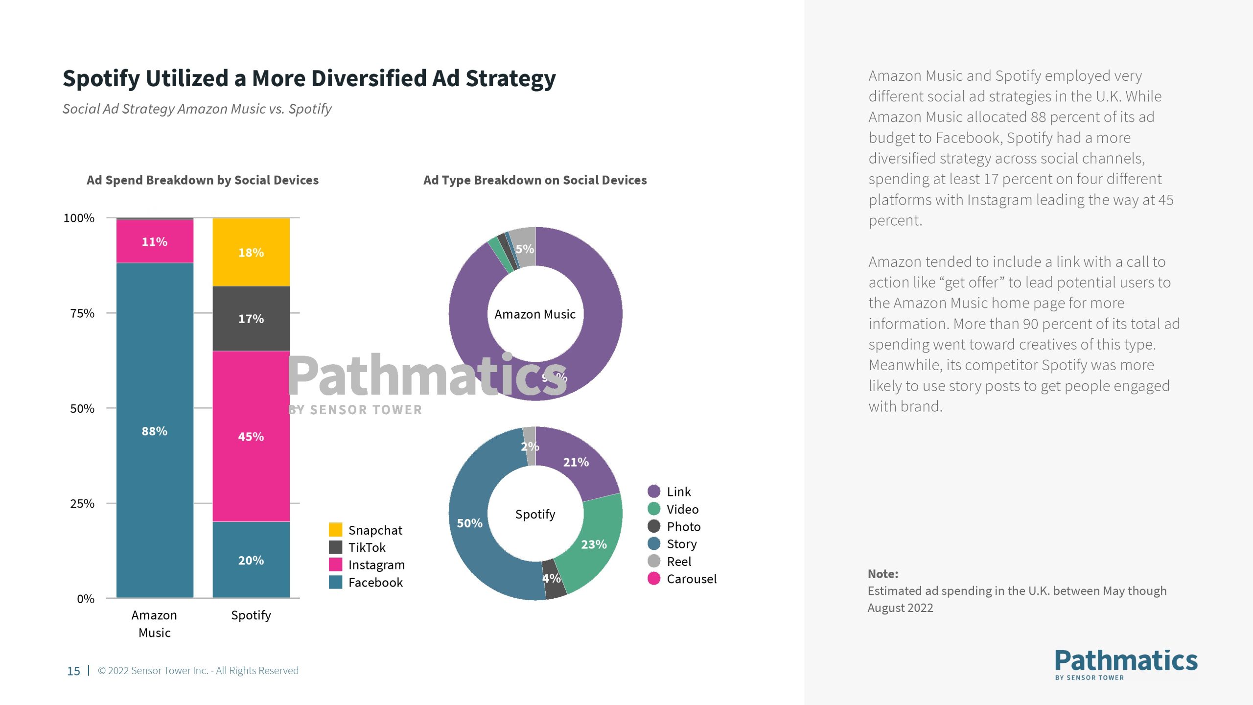 Sensor Tower 的数据显示,自2019年以来Spotify和亚马逊音乐一直是英国下载量最大的音乐应用程序。但是,到2022年为止,这两个品牌执行了截然不同的社交广告策略。Facebook是亚马逊音乐的主要广告渠道,其88%的预算用于该渠道,另有11%的预算则用于Instagram。Spotify将其广告预算更均匀地分配到四个不同的社交渠道:45%在Instagram上,20%在Facebook上,18%在Snapchat上,17%在TikTok上。Spotify倾向于使用故事类型的帖子,占其社交平台上总广告的50%。