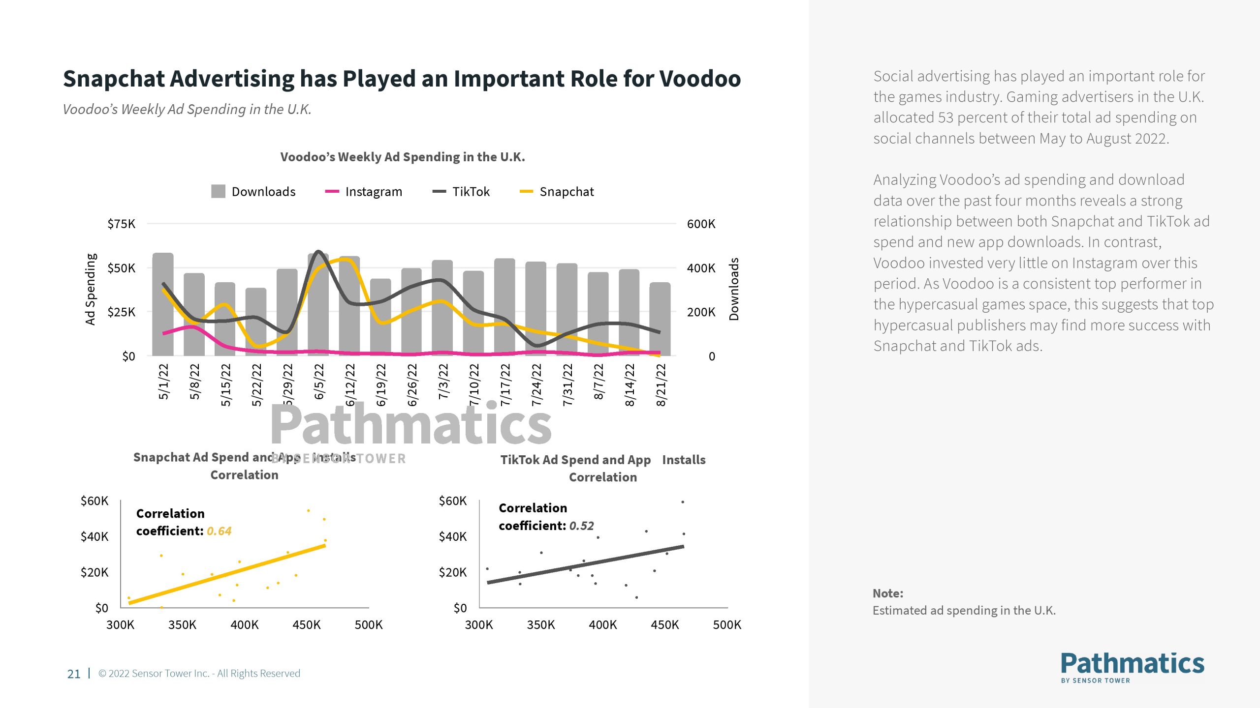 社交广告对游戏行业至关重要。2022年5月至8月,英国的游戏广告主在社交渠道上的广告支出占其总广告支出的53%。过去四个月,Voodoo的广告支出和下载数据显示,Snapchat和TikTok广告支出与新应用下载之间存在着密切关系。Voodoo的广告支出在6月的第一周和第二周左右达到顶峰,在此期间下载量超过40万次。