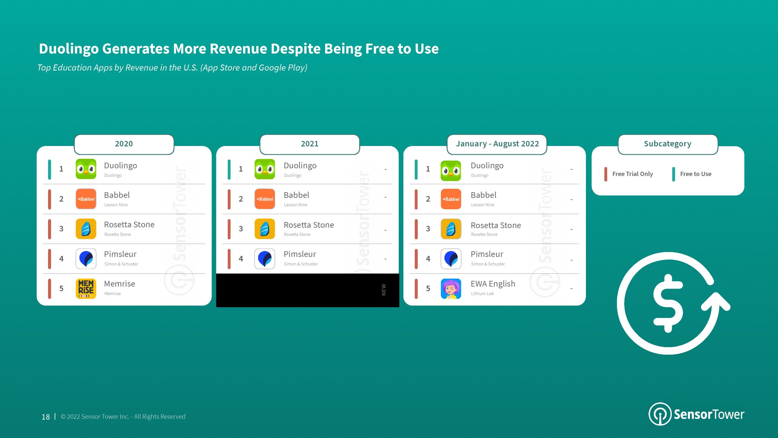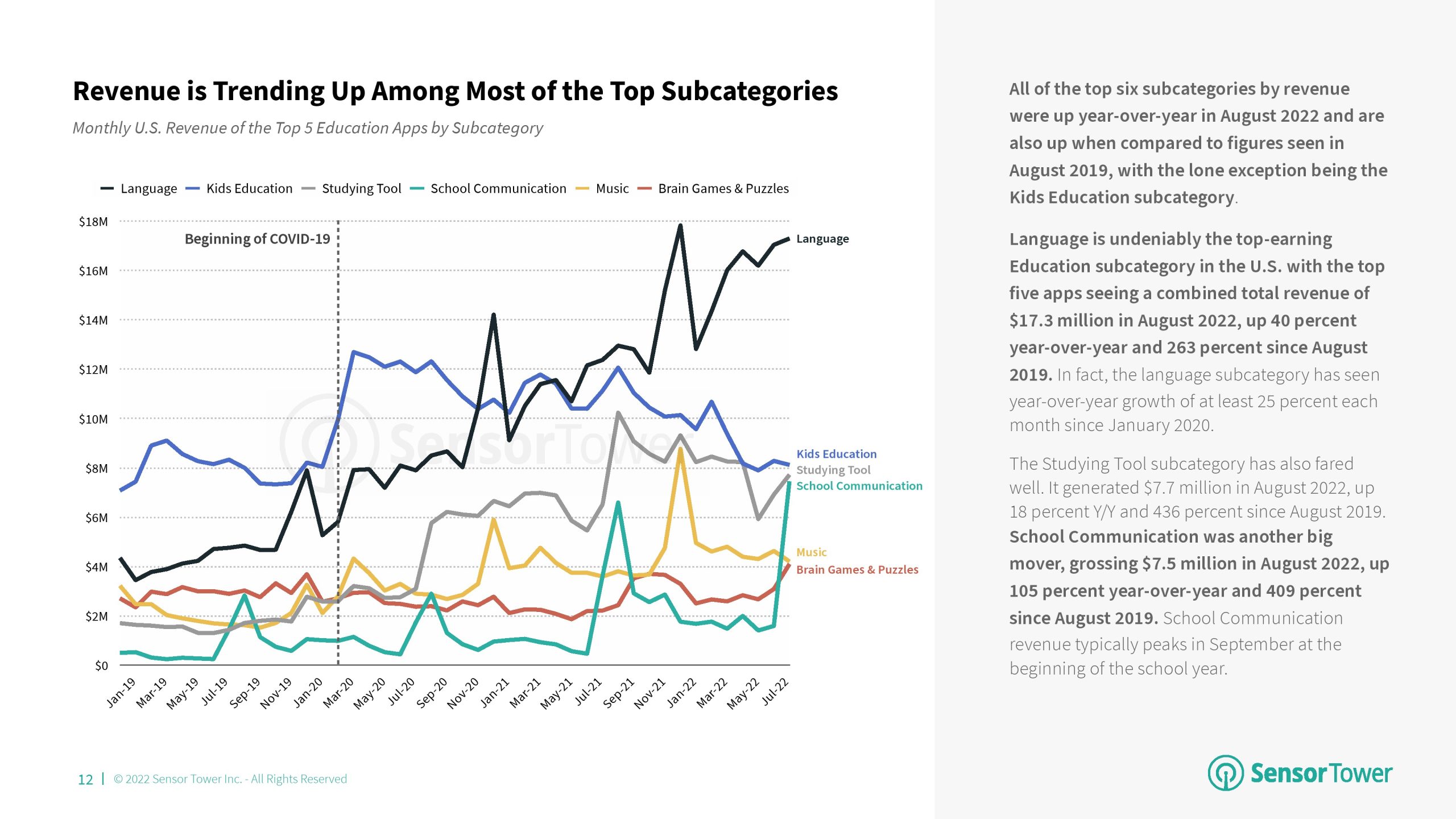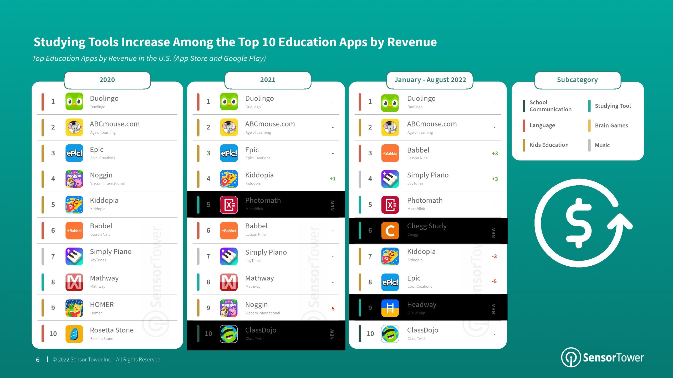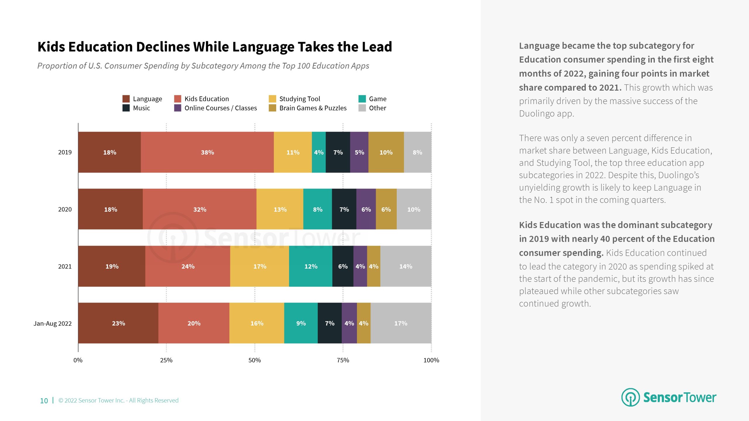 2022年前8个月,语言成为教育的首要分支,与2021年相比,其市场份额增加了4个百分点。该分支的增长主要归功于Duolingo的成功。语言、儿童教育和学习工具是2022年美国消费者支出排名前三的教育应用分支,每个分支之间的市场份额仅相差7个百分点。尽管Kiddopia和Epic等“儿童教育”应用程序在2020年以“教育”为首,但该分支的增长已经趋于平稳,而其他分支则继续增长。