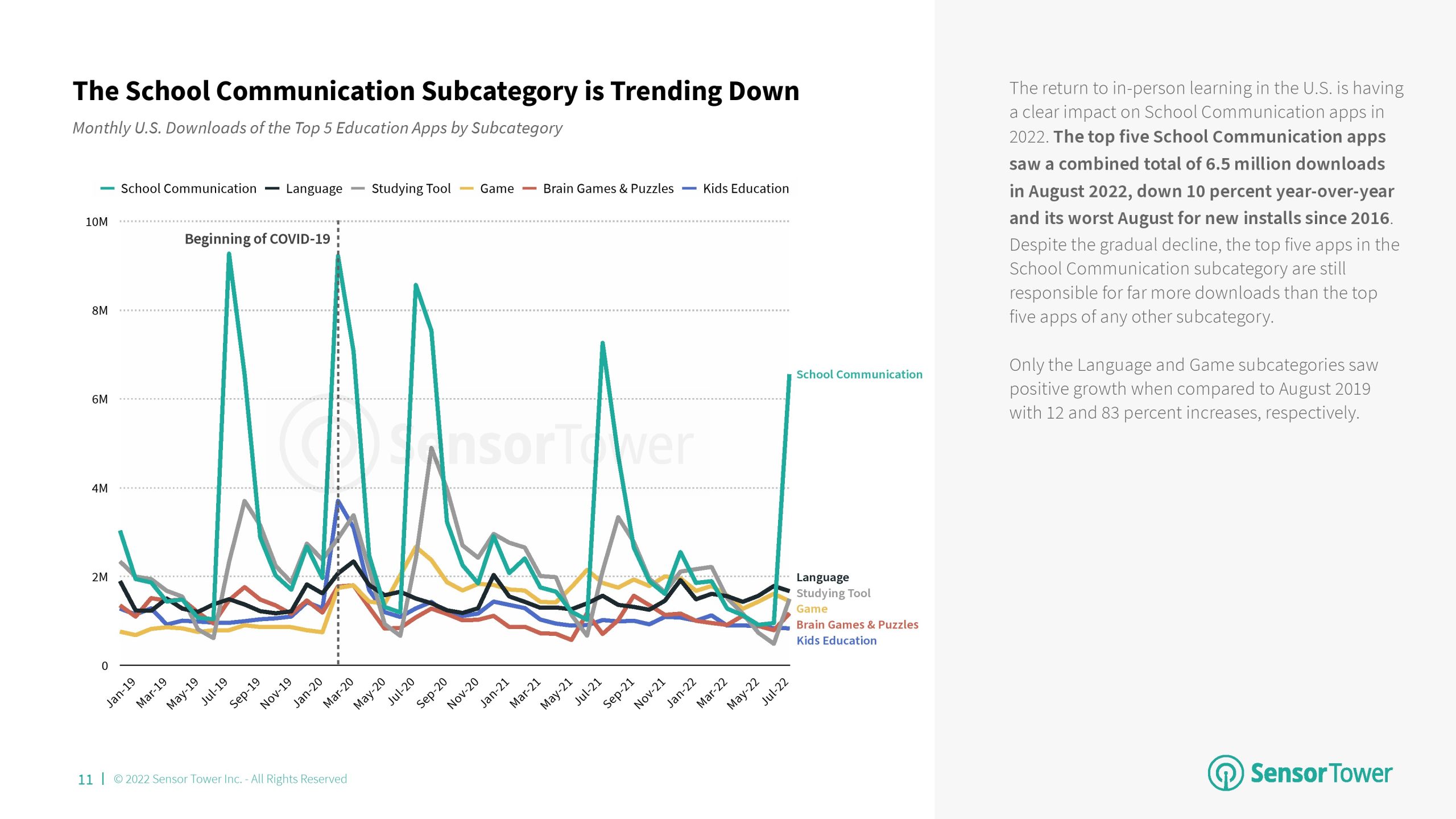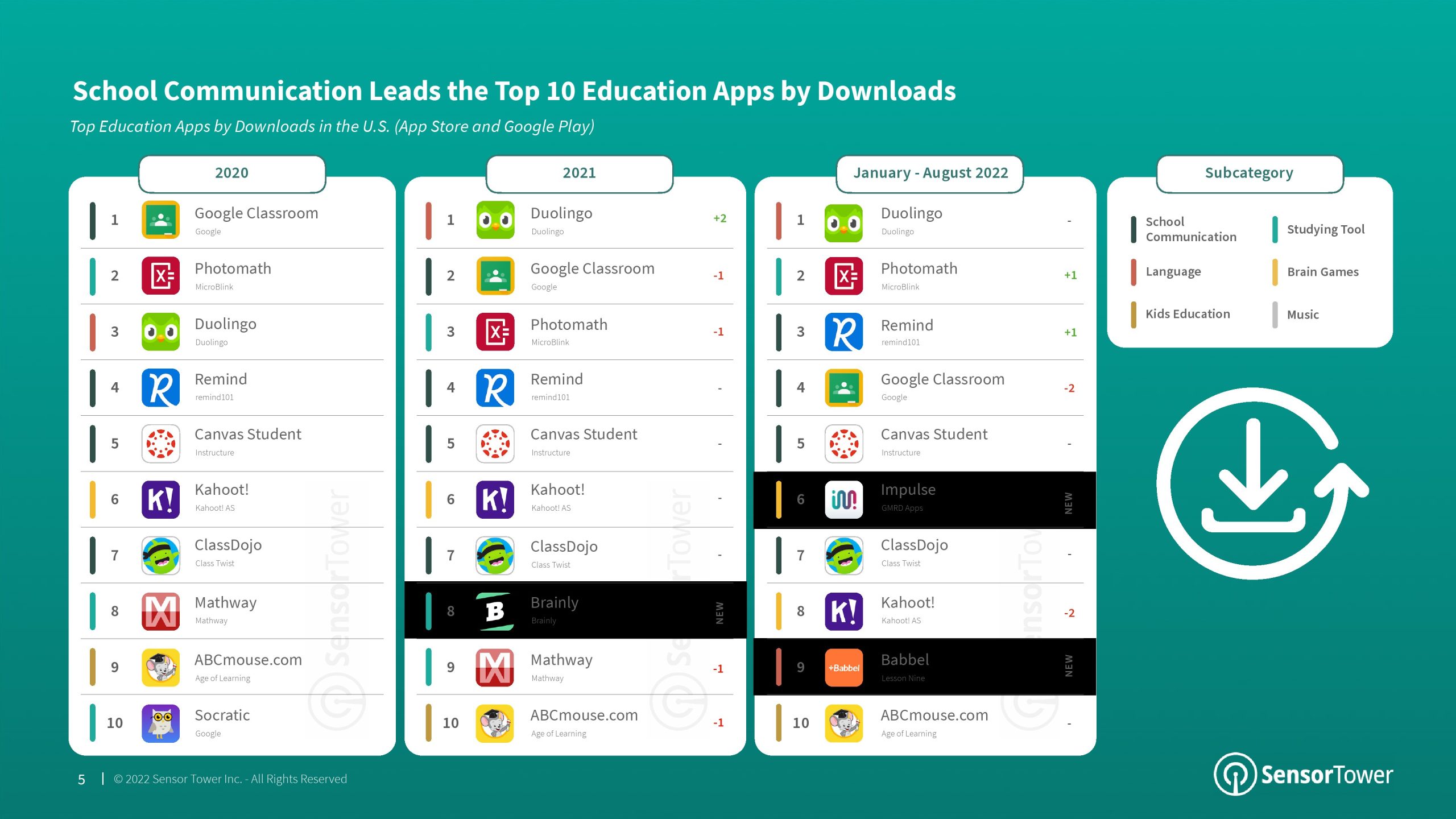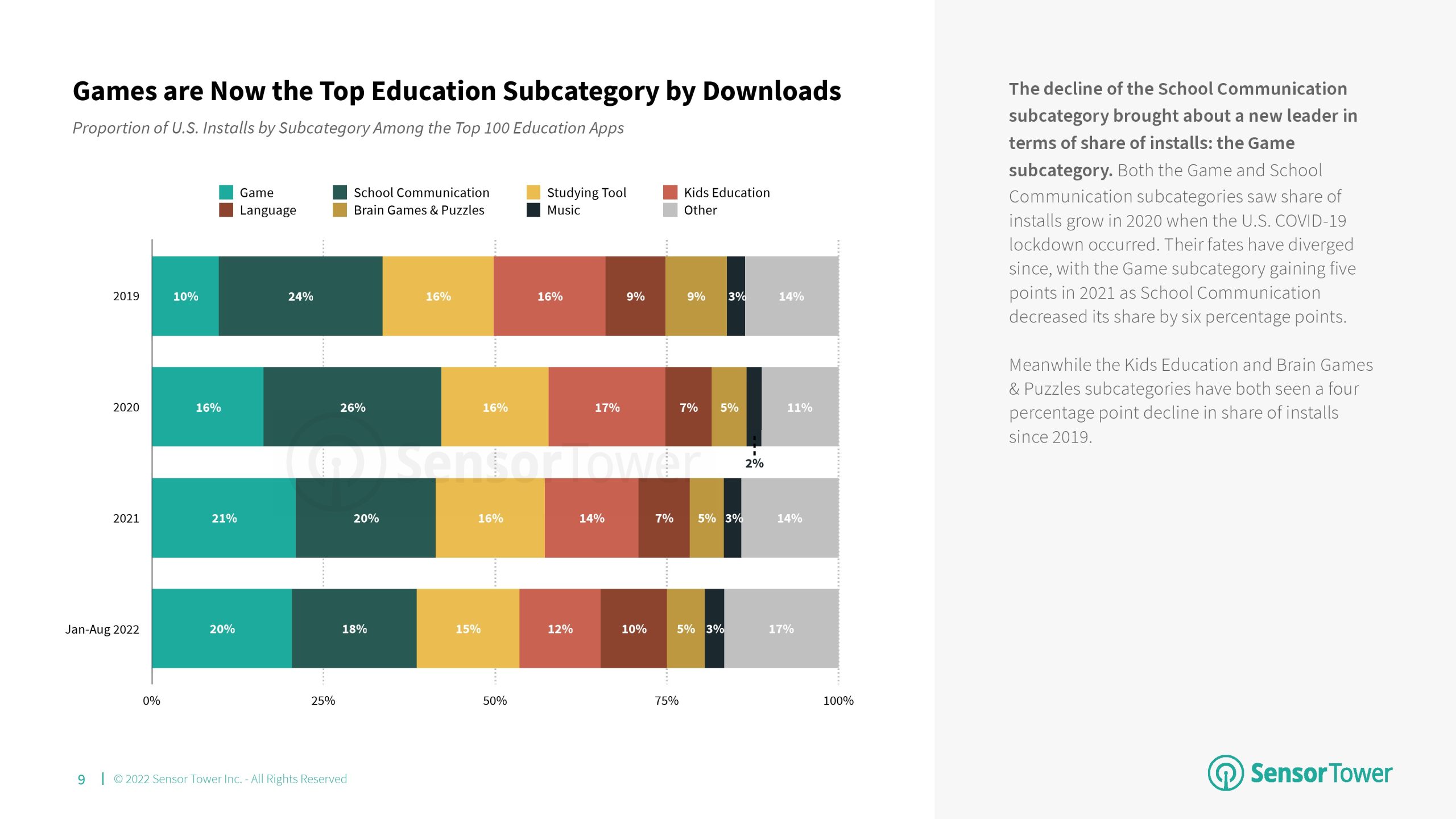2022年前8个月,语言成为教育的首要分支,与2021年相比,其市场份额增加了4个百分点。该分支的增长主要归功于Duolingo的成功。语言、儿童教育和学习工具是2022年美国消费者支出排名前三的教育应用分支,每个分支之间的市场份额仅相差7个百分点。尽管Kiddopia和Epic等“儿童教育”应用程序在2020年以“教育”为首,但该分支的增长已经趋于平稳,而其他分支则继续增长。