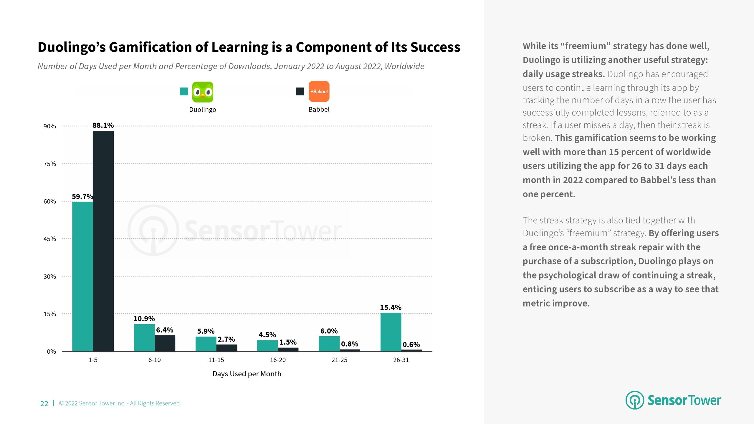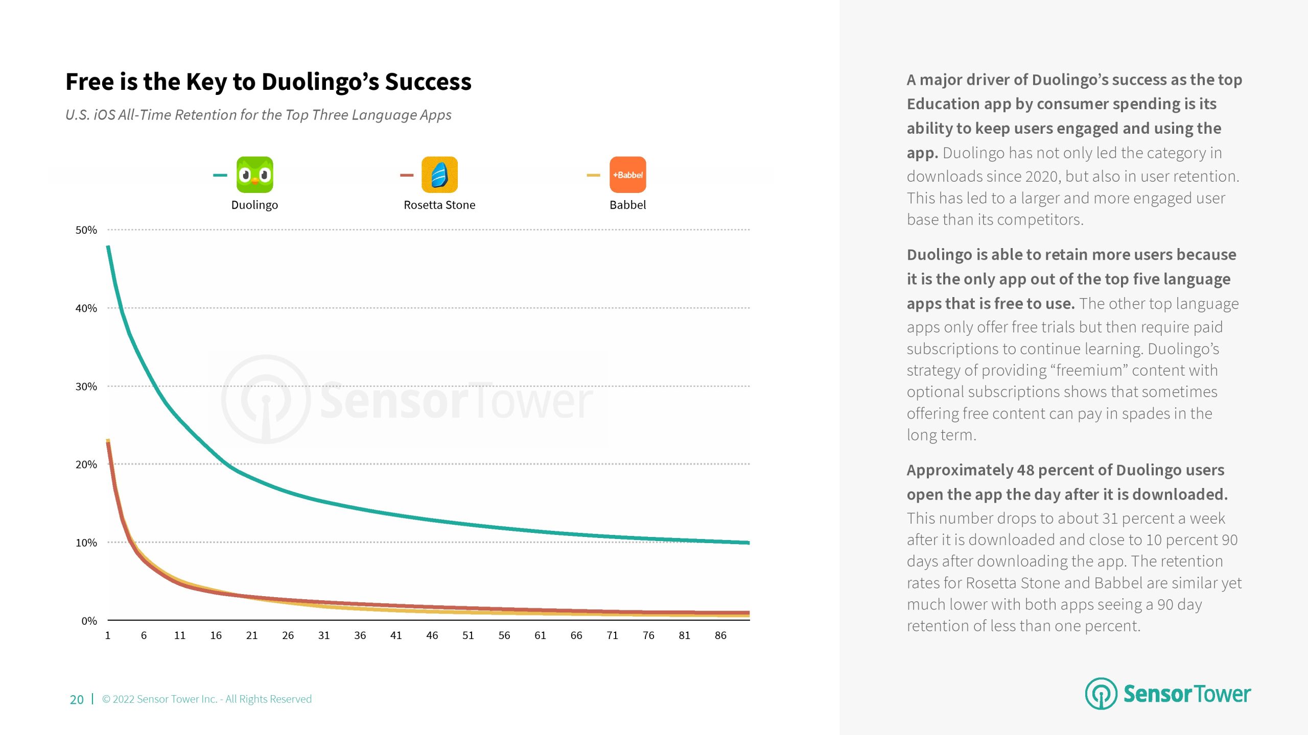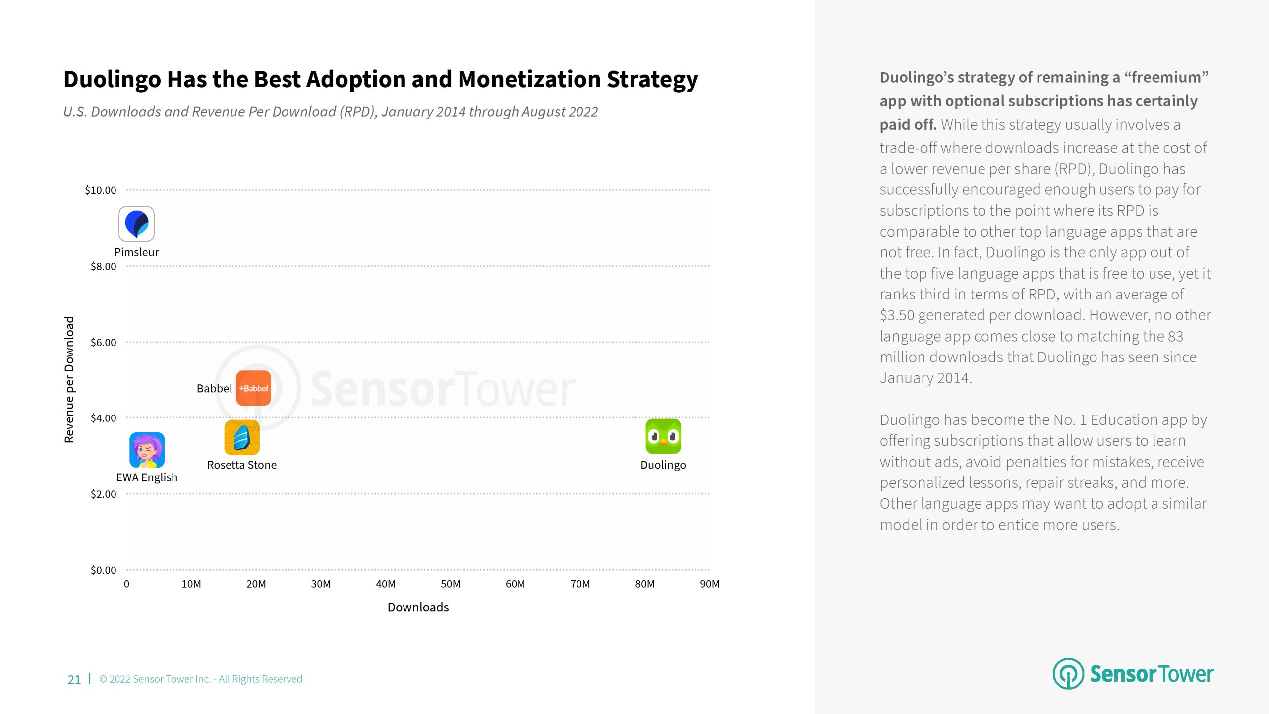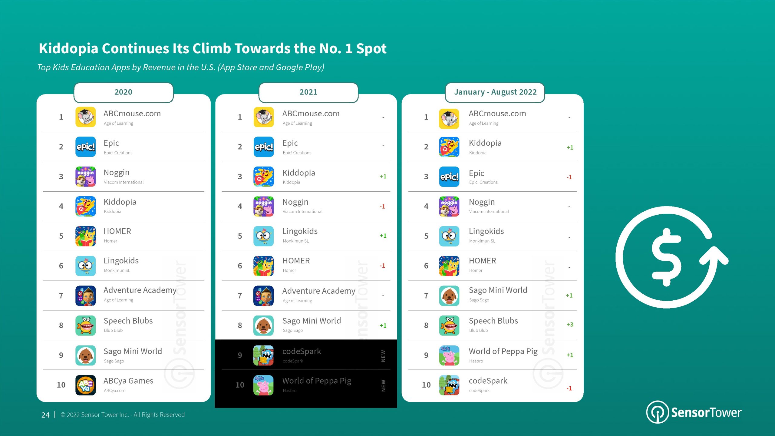 2022年前8个月,语言成为教育的首要分支,与2021年相比,其市场份额增加了4个百分点。该分支的增长主要归功于Duolingo的成功。语言、儿童教育和学习工具是2022年美国消费者支出排名前三的教育应用分支,每个分支之间的市场份额仅相差7个百分点。尽管Kiddopia和Epic等“儿童教育”应用程序在2020年以“教育”为首,但该分支的增长已经趋于平稳,而其他分支则继续增长。