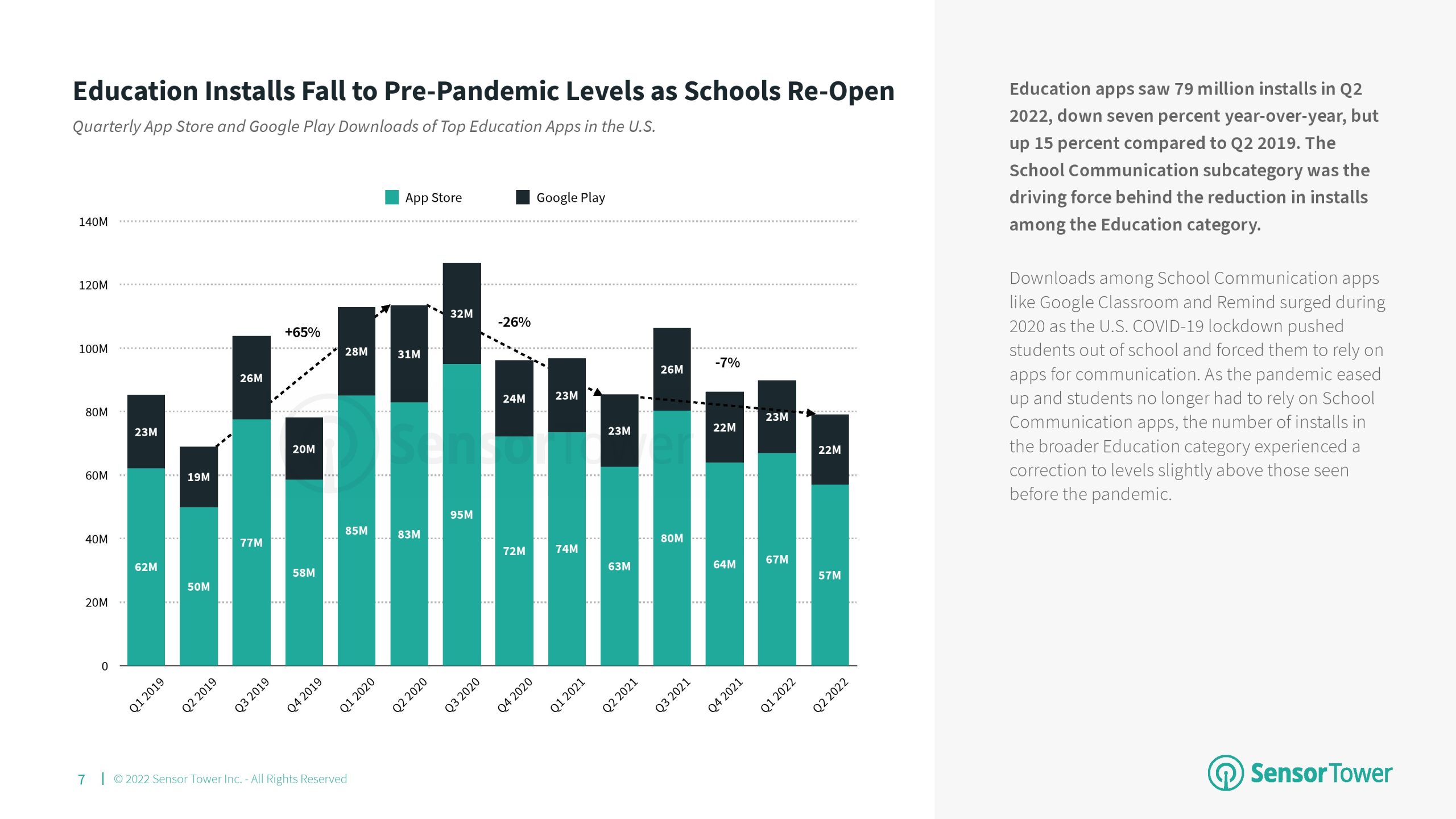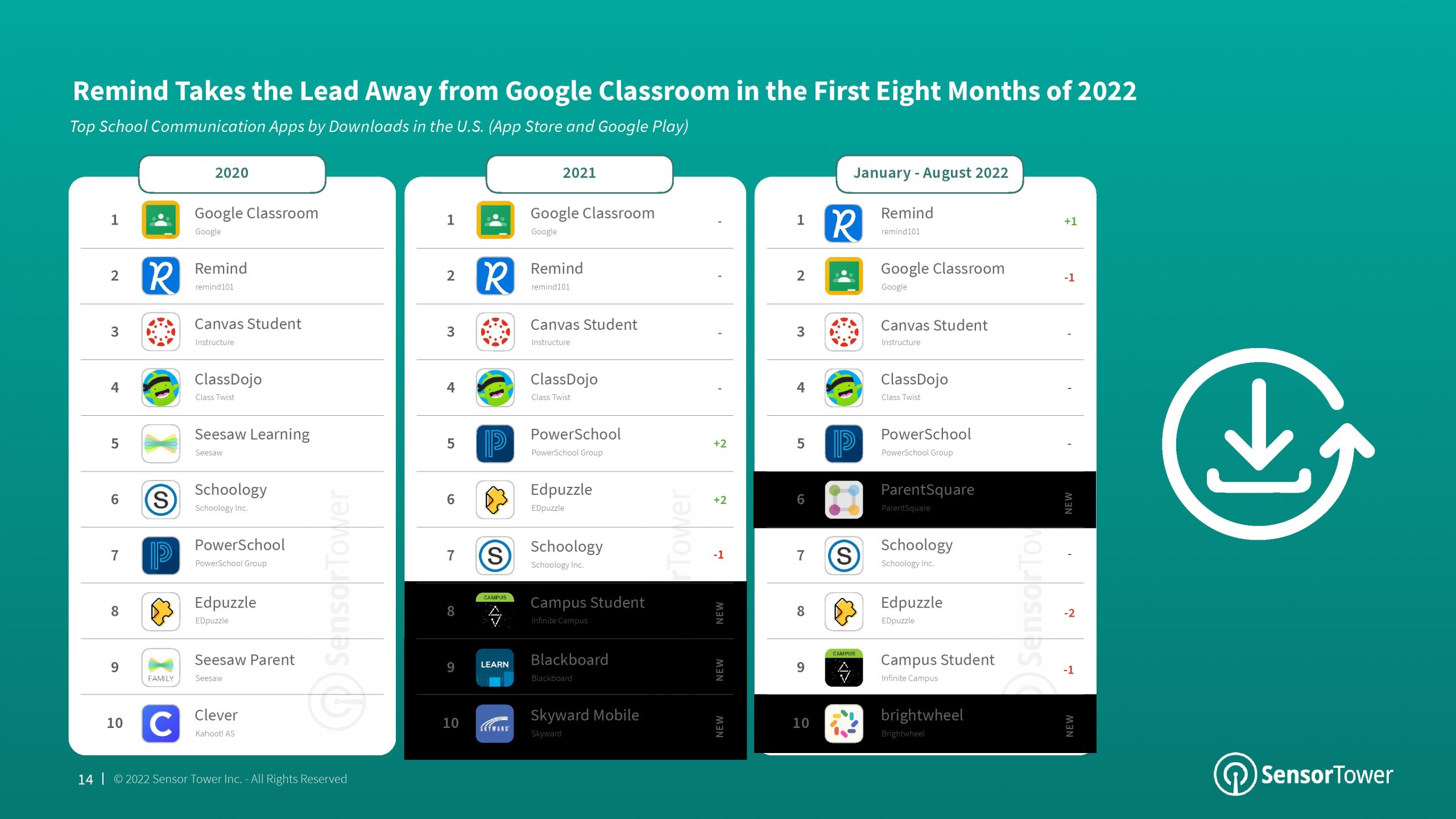 虽然Sensor Tower 的数据显示,2022年美国教育应用程序安装量下降,但其收入继续显著增长,2022年第二季度达到2.74亿美元。在最新的美国教育应用程序报告中,Sensor Tower分析涵盖了学校通信、语言和儿童教育应用程序的下载和收入趋势。