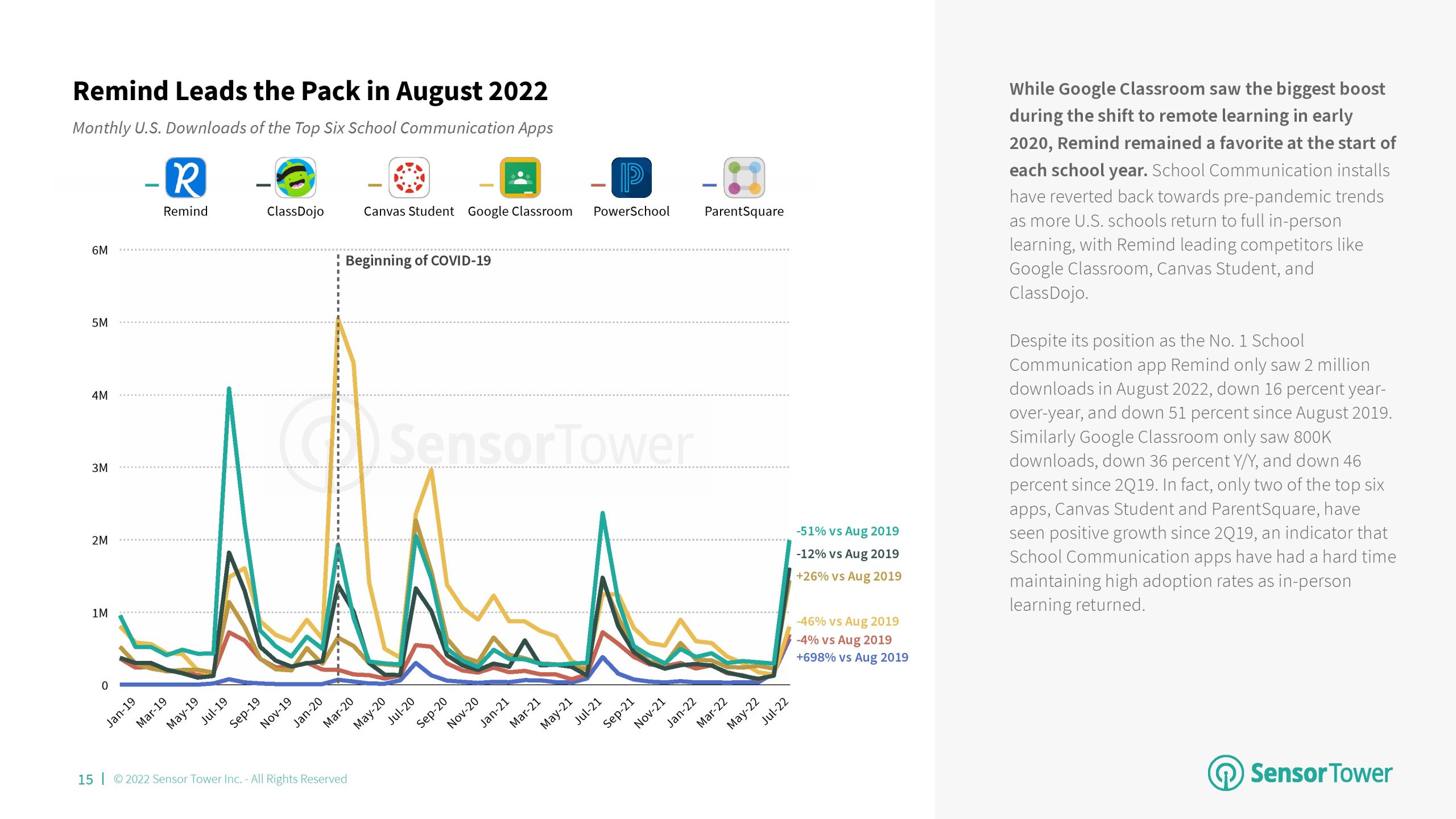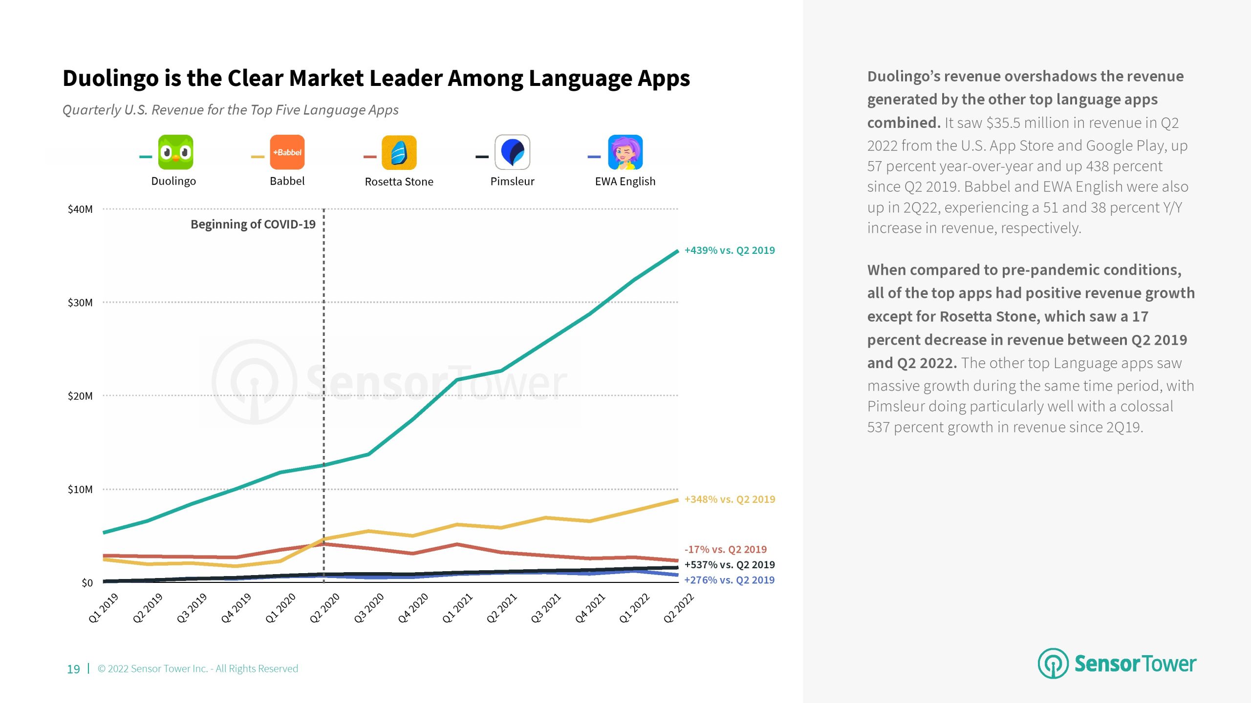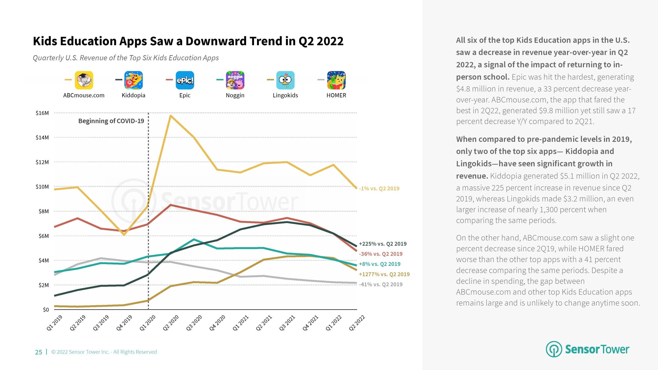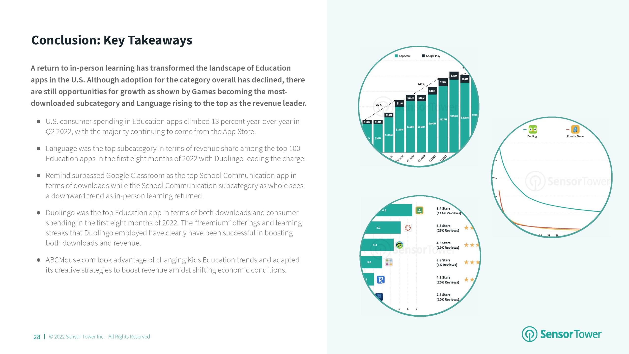 2022年第二季度,美国教育应用程序的下载量为7900万次,同比下降7%。尽管采用率有所下降,但与2019年第二季度相比,教育应用收入增长了183%。2022年第二季,Duolingo在下载量和收入方面位居第一。该应用程序在教育类应用收入增长中占很大比例。
