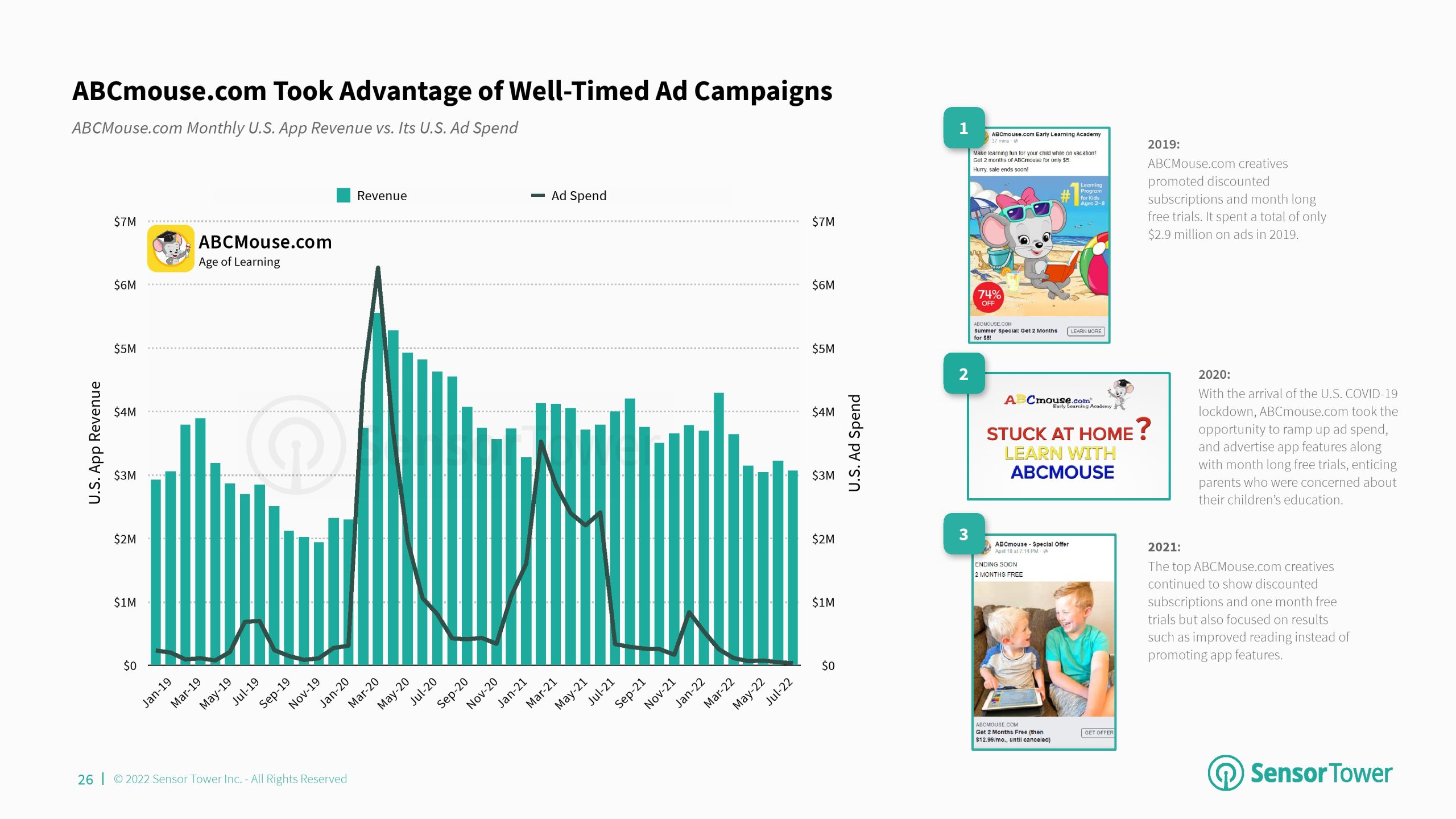ABCmouse.com是一个基于订阅的数字教育程序,是美国收入排名第一的儿童教育应用程序。随着新冠肺炎疫情在美国出现和流行,该程序通过增加广告支出,从适时的活动中受益。ABCmouse.com花费超过600万美元,它的创意突出了应用程序的功能和长达一个月的免费试用,吸引了关心孩子教育的家长。