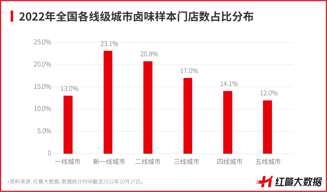 红餐大数据显示,各个线级城市的卤味门店占比相差不大,门店分布较为均匀。其中三线城市和四线城市的门店占比更超一线城市,可见卤味的下沉属性较为突出,卤味品类在低线城市的发展潜力有待继续释放。