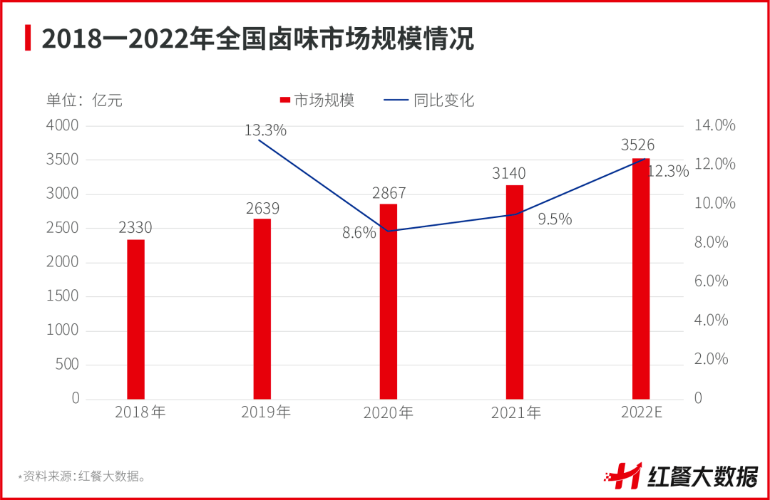 据红餐大数据,近五年来,千亿规模的卤味市场稳中有进,发展势头持续向好。2021年我国卤味市场规模约3140亿元,同比增长了9.5%。2022年,卤味的市场规模有望继续扩大到3526亿元,增长幅度约为12.3%。