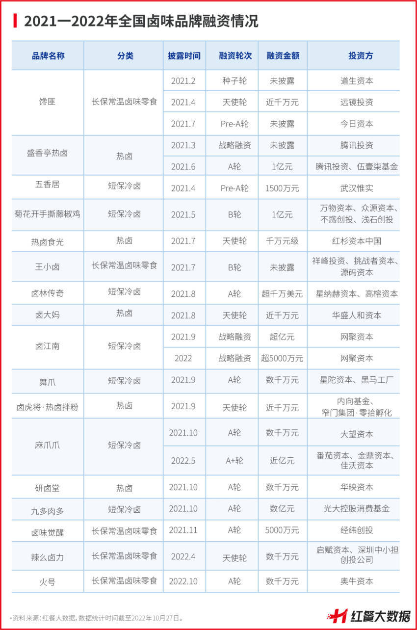 新式热卤热度下滑也可从资本方的态度看出。红餐大数据显示,2021年热卤赛道的融资事件共计6起,占卤味全品类融资事件数的三成,而进入2022年,截至10月27日,热卤赛道尚未有相关融资事件披露。可见资本对于热卤品牌的投资趋于冷静,态度变得谨慎。