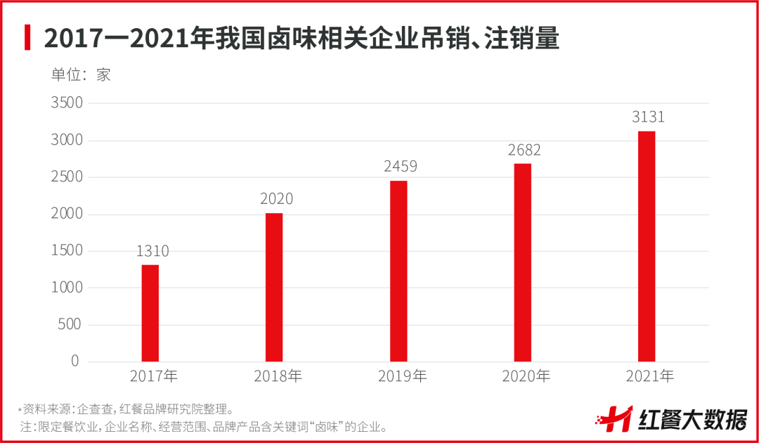 在这样的背景下,卤味赛道竞争加剧,中小企业承压颇重,赛道加快洗牌出清速度。企查查数据显示,自2017年至2021年,我国卤味相关企业吊销、注销量持续上升,自2017年的1310家上升至2021年的3131家,五年间增长超1倍。