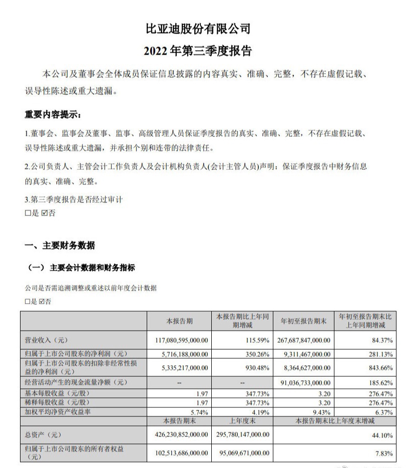 比亚迪股份现公布最新财报:第三季度净利润 57.16 亿元,同比增长 350.26%。