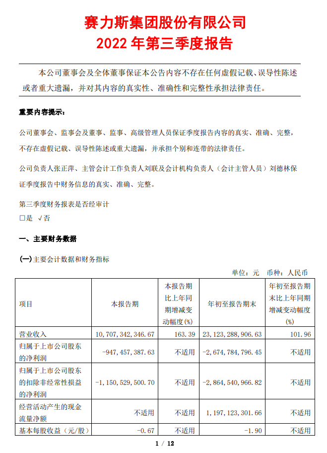 赛力斯公布了最新财报:第三季度营业收入 107.07 亿元,同比增长 163.39%,前三季度营收 231.23 亿元,同比增长 101.96%;今年第三季度净亏损 9.47 亿元,前三季度净亏损 26.75 亿元。