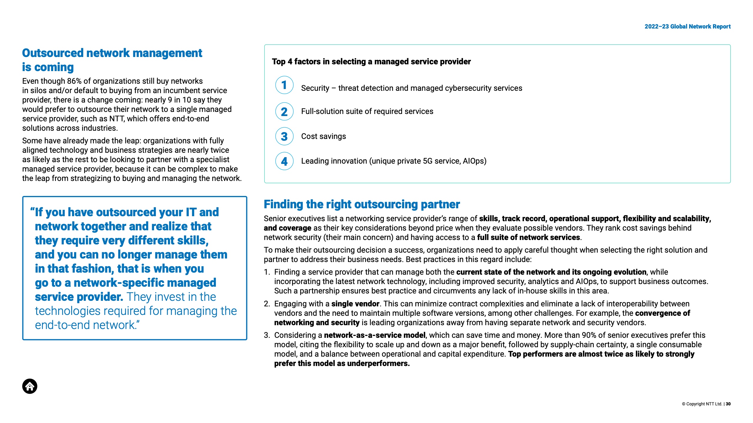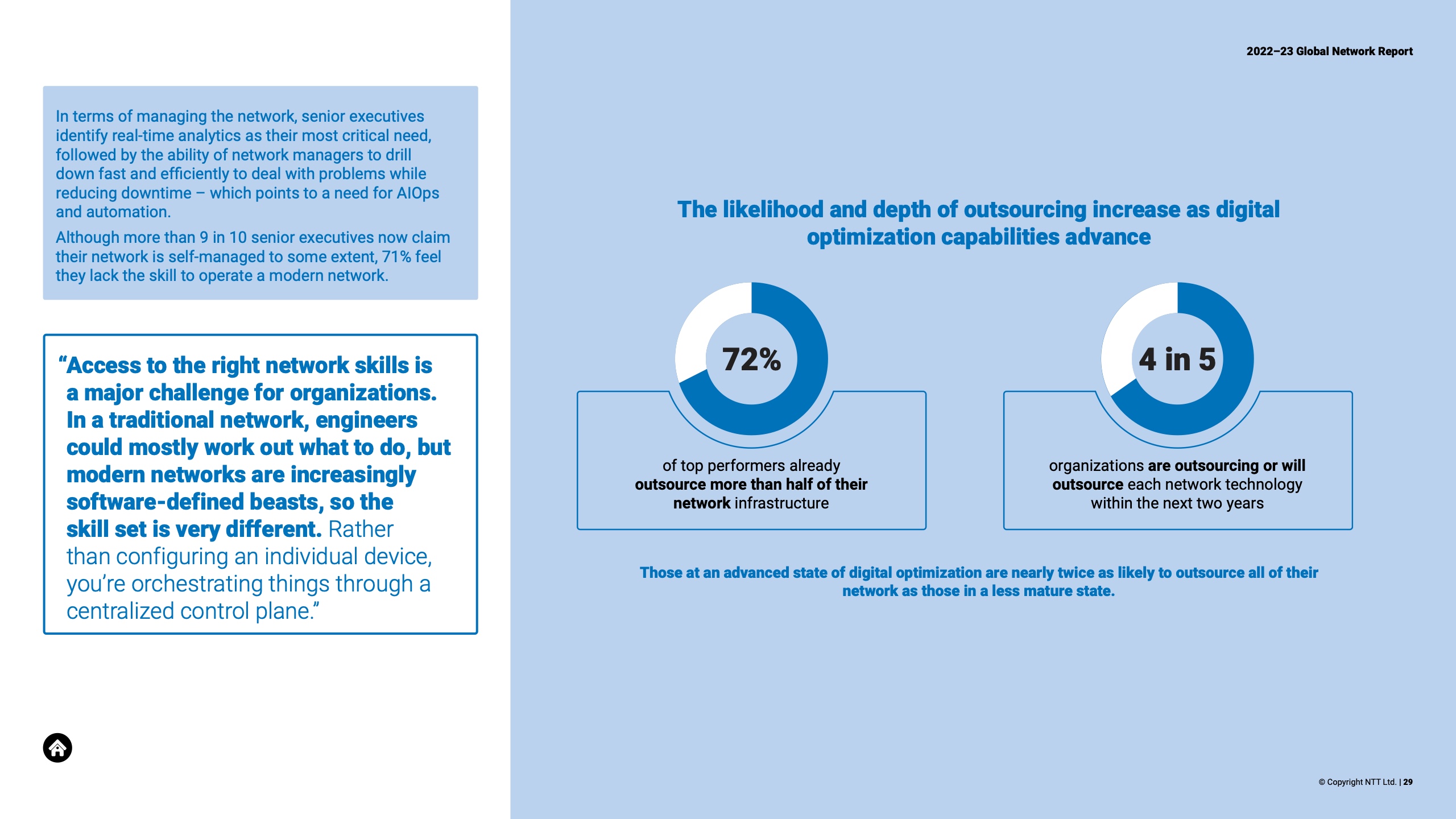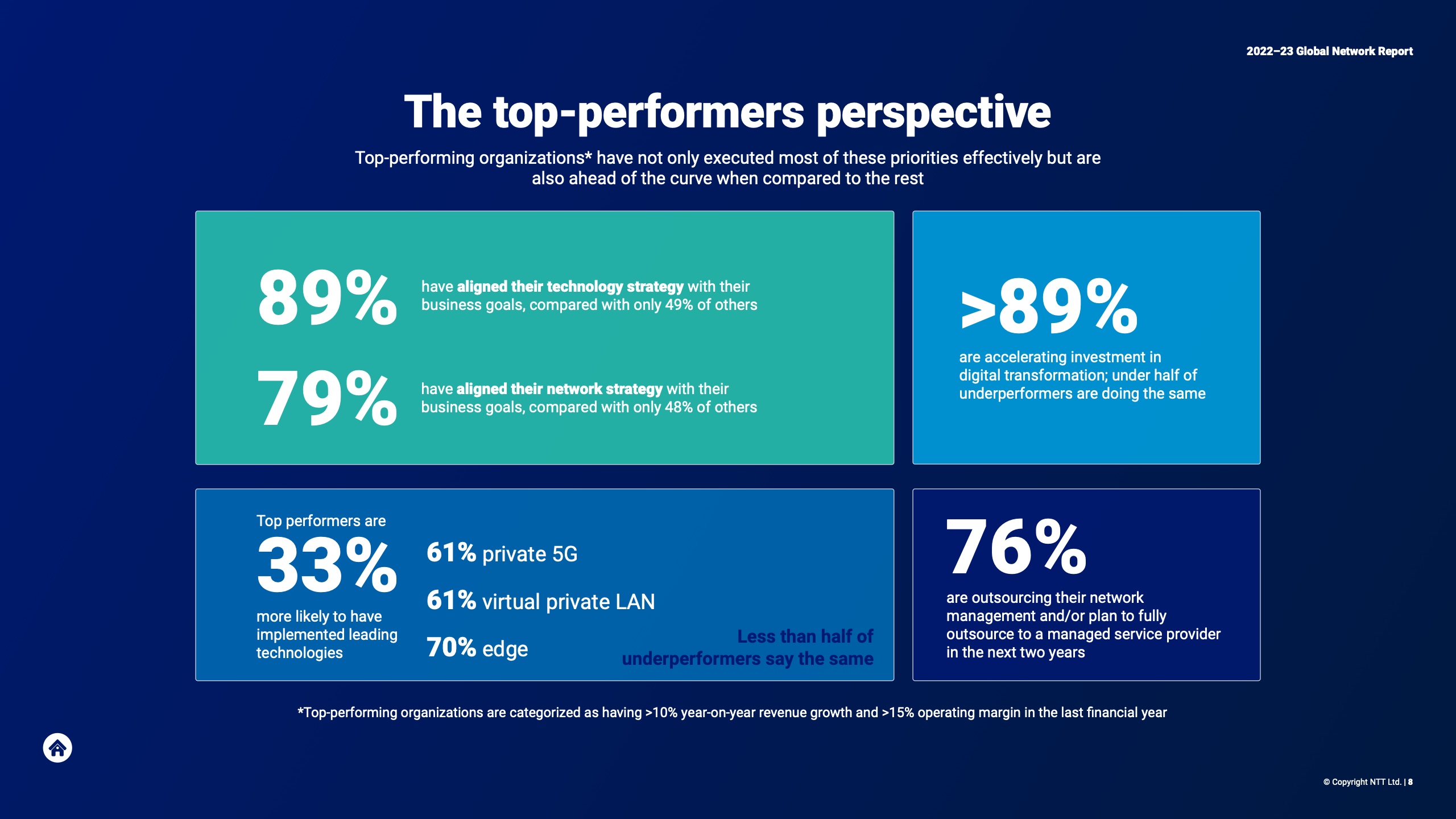 - 72% 的绩优企业(过去一年的年收入增加 > 10%,运营利润率 > 15%),已经将一半以上的网络基础设施外包;