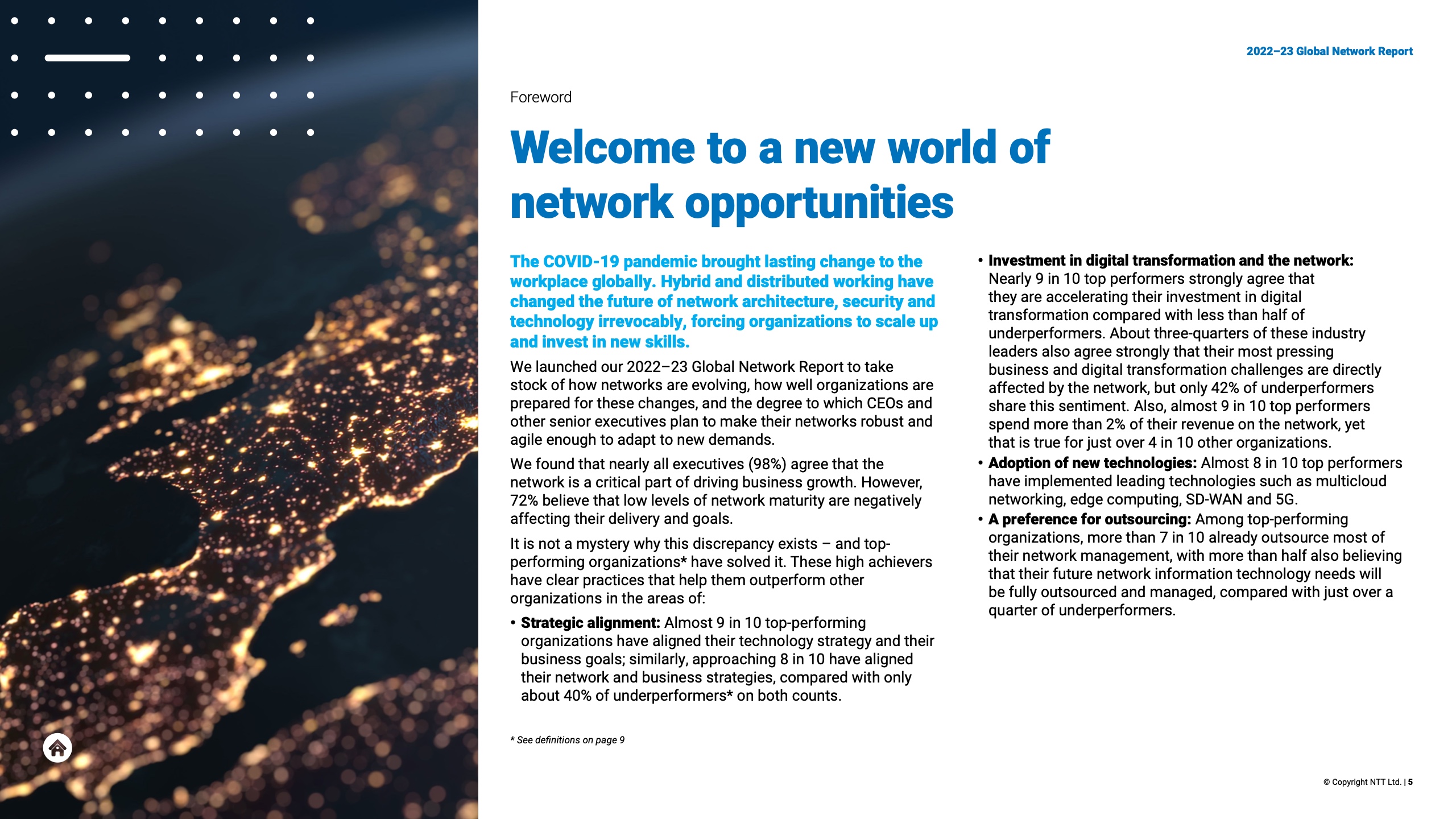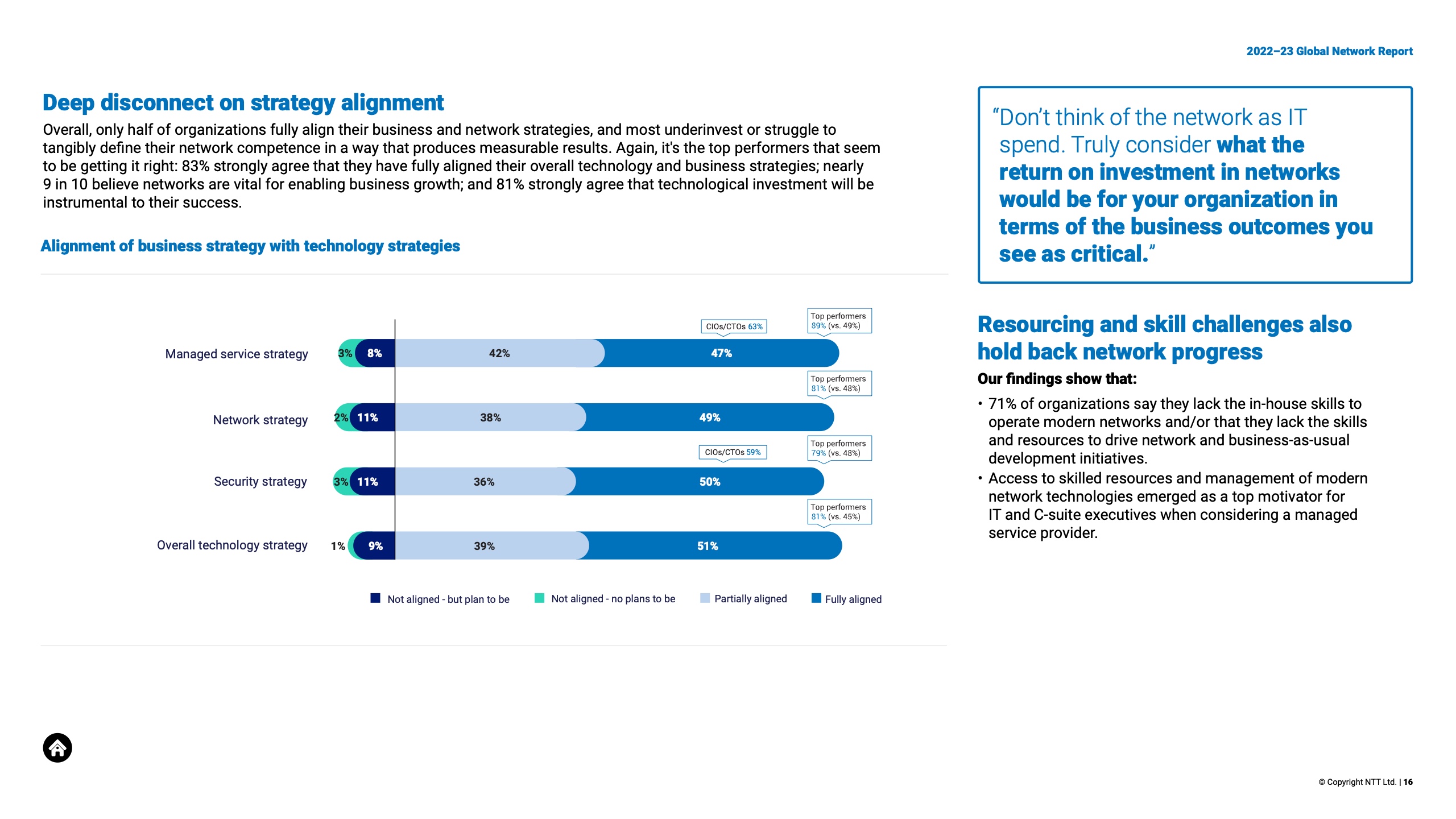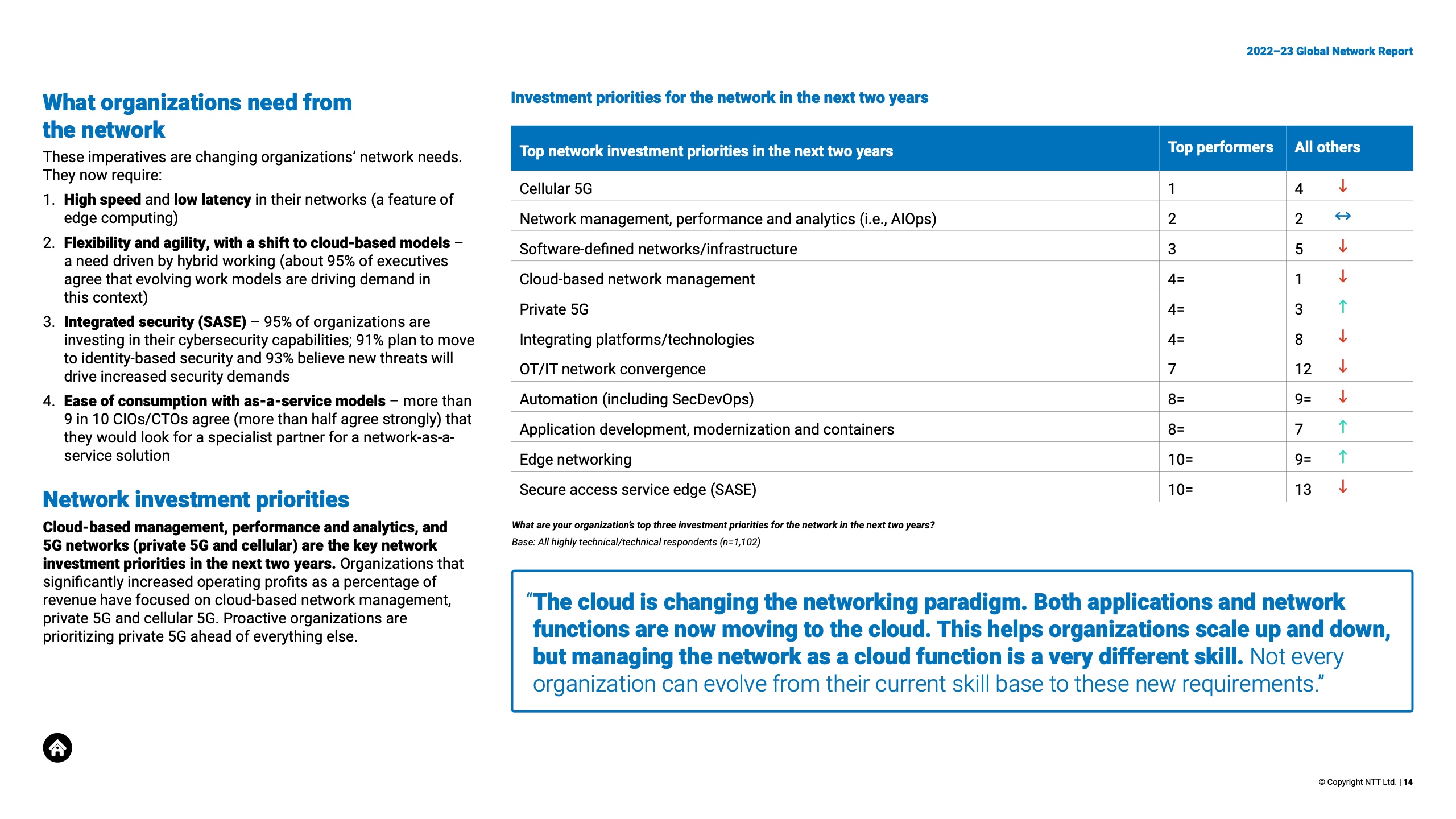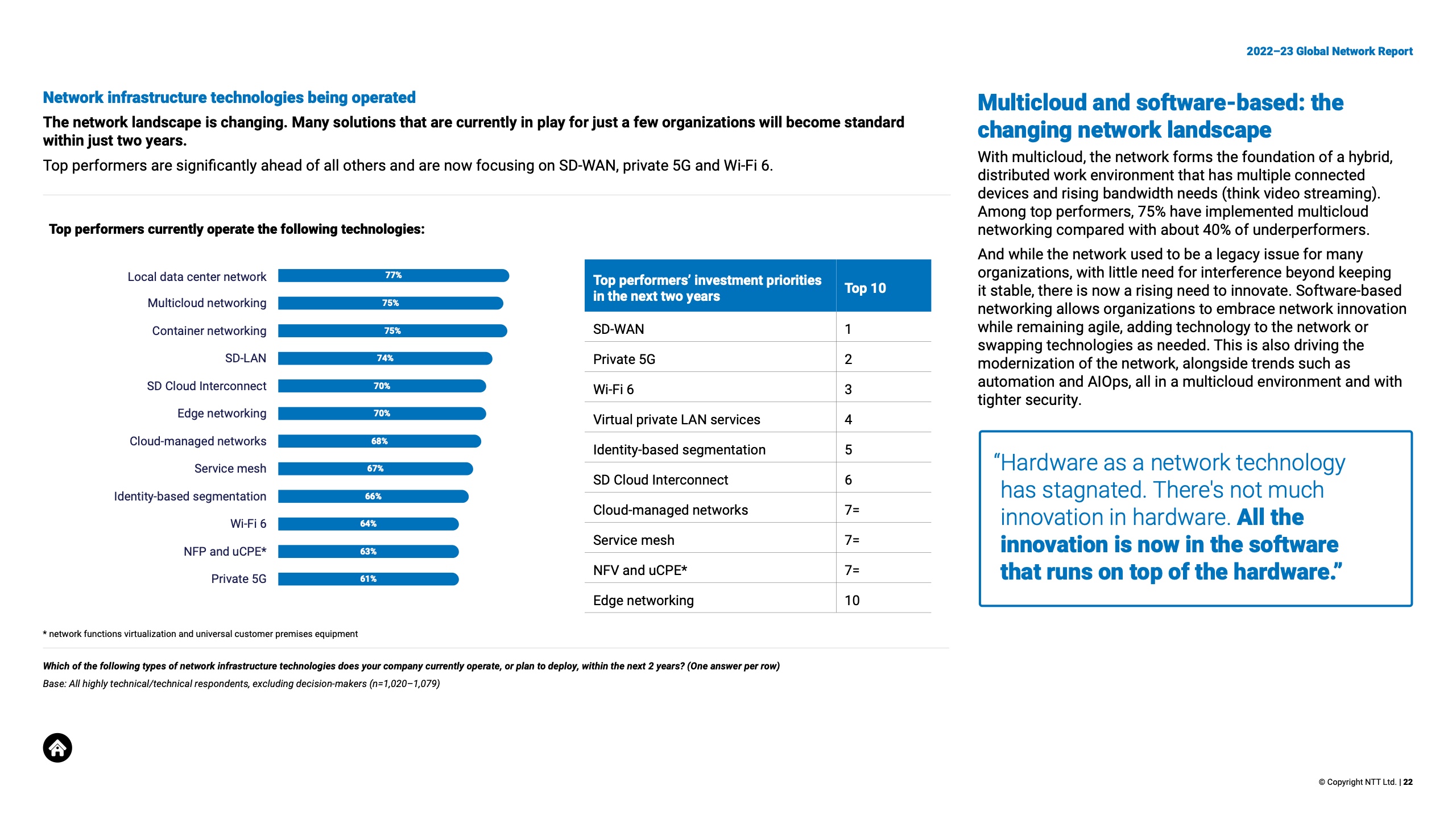 - 72% 的绩优企业(过去一年的年收入增加 > 10%,运营利润率 > 15%),已经将一半以上的网络基础设施外包;