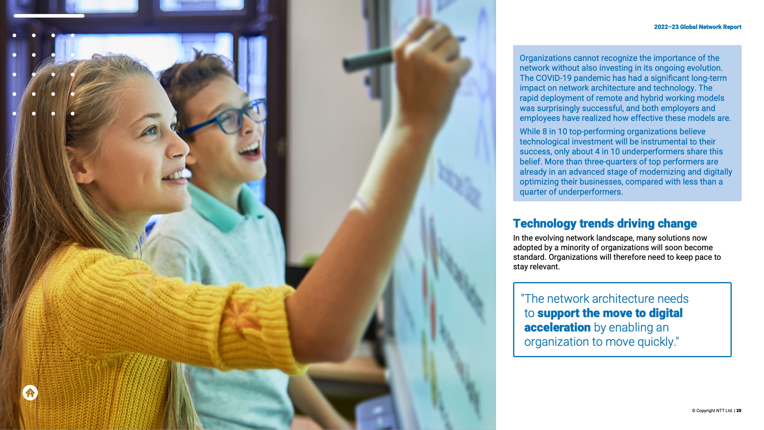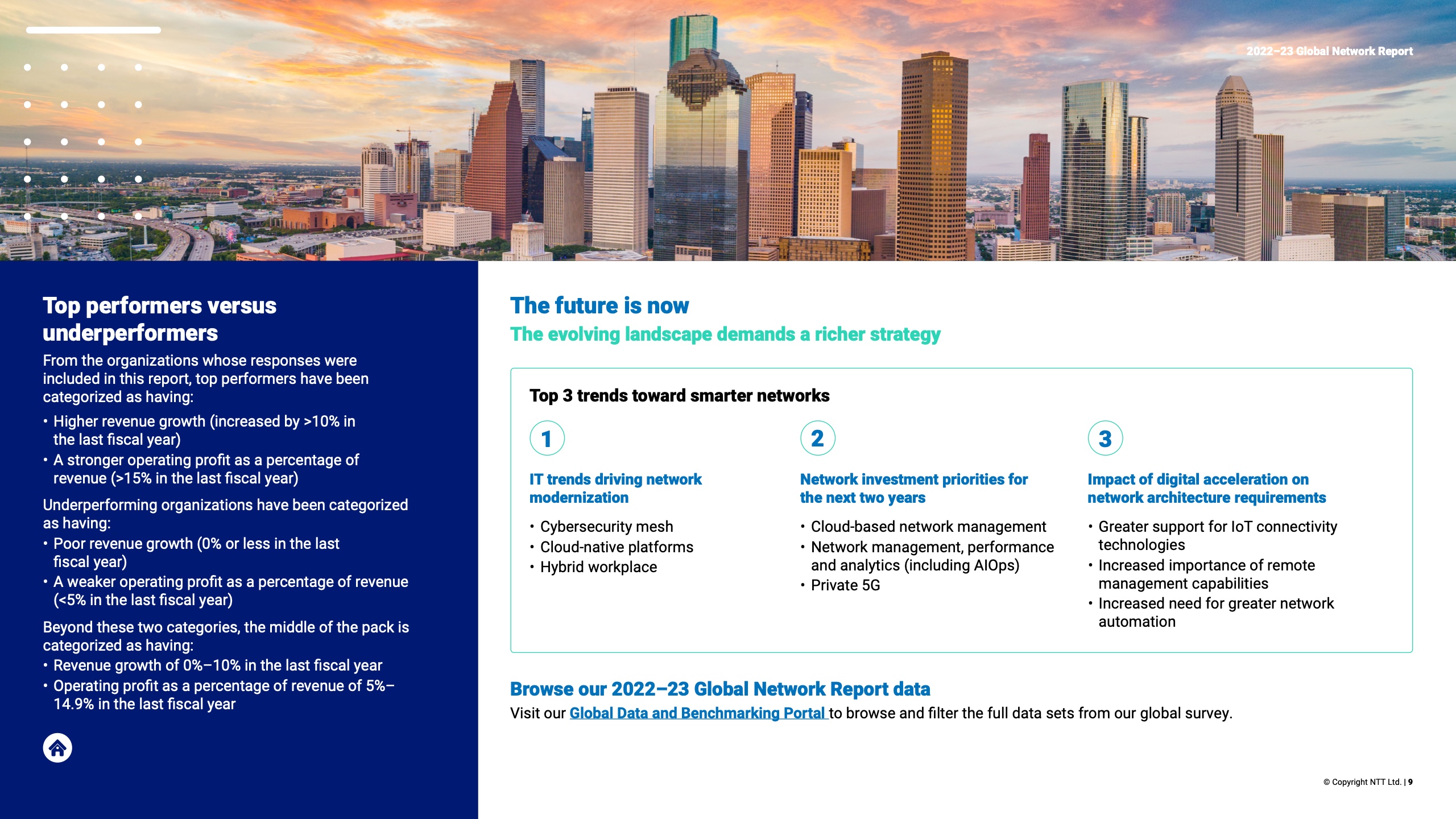 新型的工作方式推动企业转型,很多绩优企业通过投资于包括核心企业网络、边缘计算(Edge)、人工智能等战略性技术,从而实现了预期目标。新兴数字化服务及应用提出了新的网络需求,很多企业对其企业网络进行了现代化改造,以便更有效地使用和管理支撑其企业的网络。
