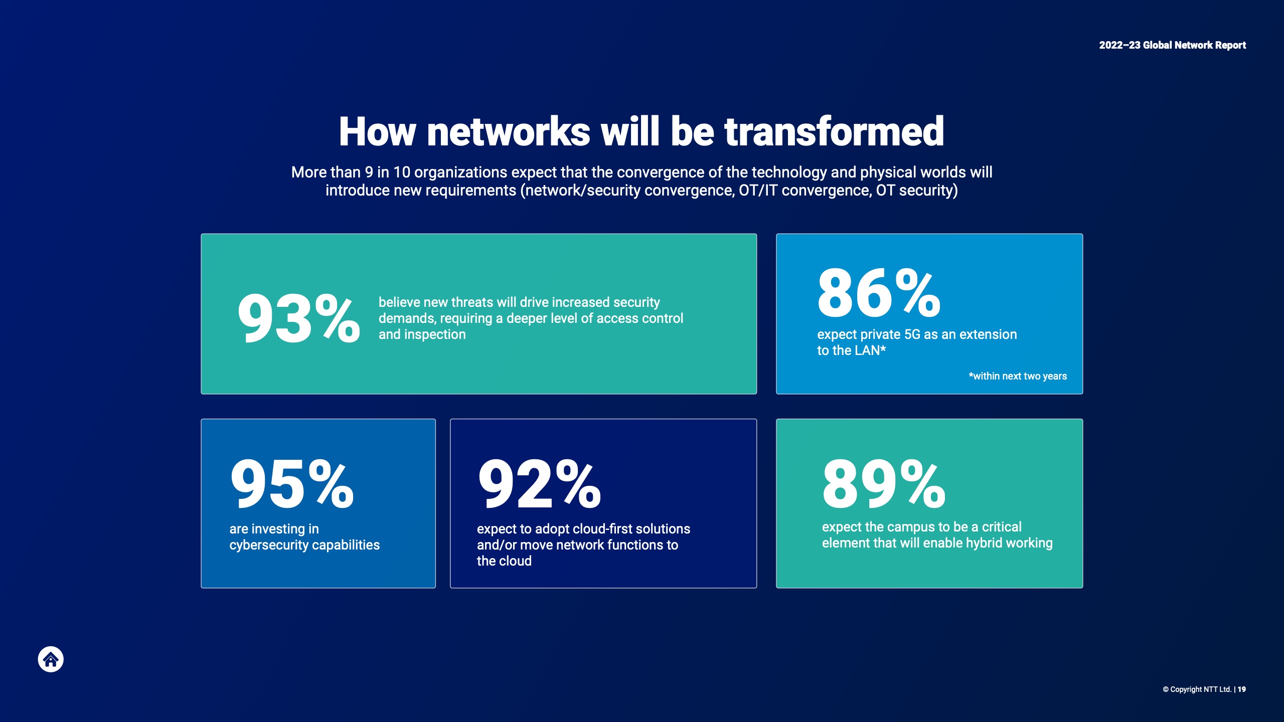 随着分布式混合办公模式为恶意网络攻击提供了更多的机会,网络安全的重要性已成为网络体系结构的一个重要组成部分。这促使企业转向采用更集中、基于云的安全解决方案和托管端点安全模式,并加大对网络安全的投入。93% 的企业领导人认为,新的威胁将推动企业网络安全需求的增加,以及更深层次的访问控制和检查需要。