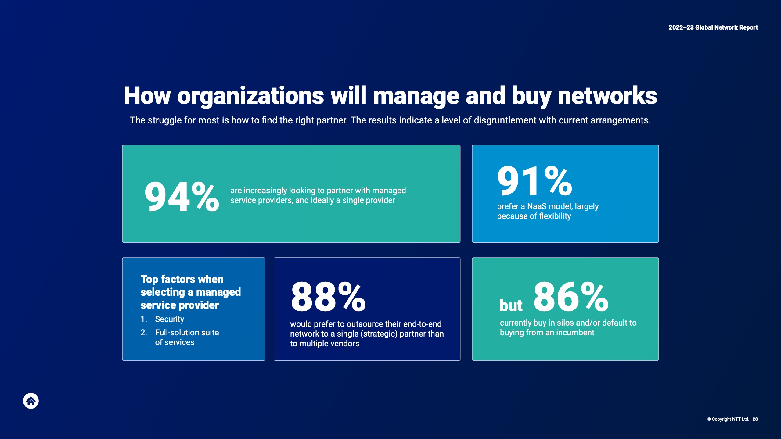 研究结果显示,企业在网络方面的投资激增。很多企业倾向于采用关键合作伙伴的管理服务解决方案来满足网络现代化需求。这不仅可以提高安全性,还可获取优化能力、加速创新所需要的新技能。