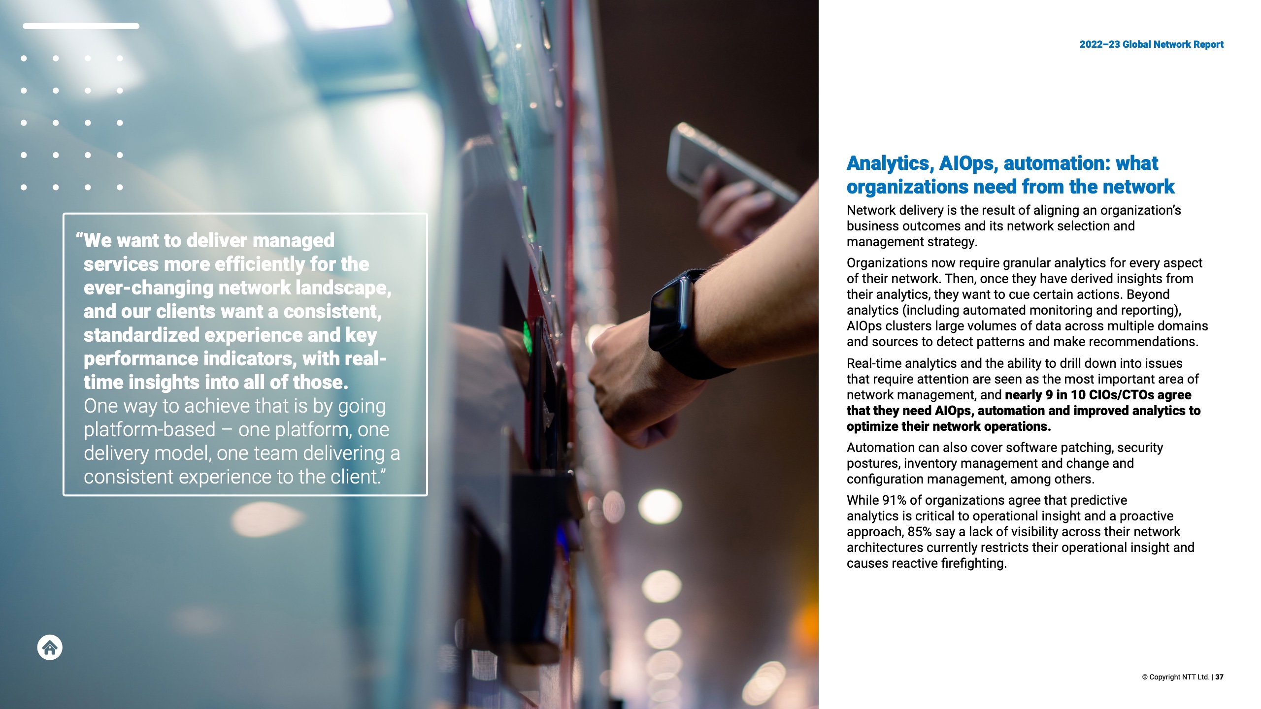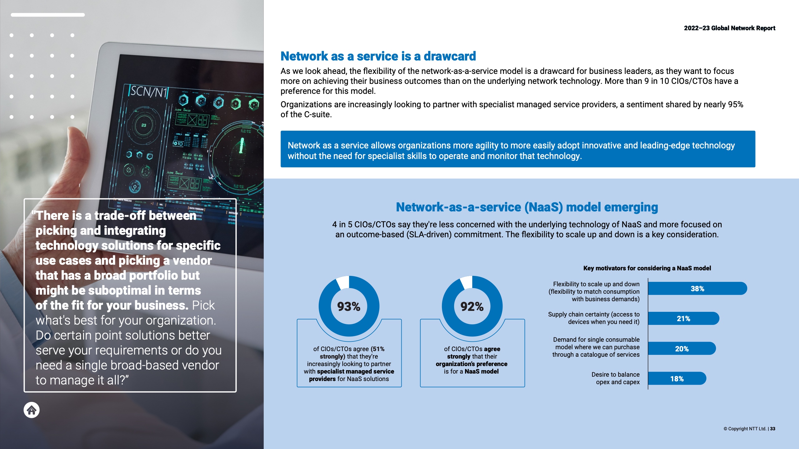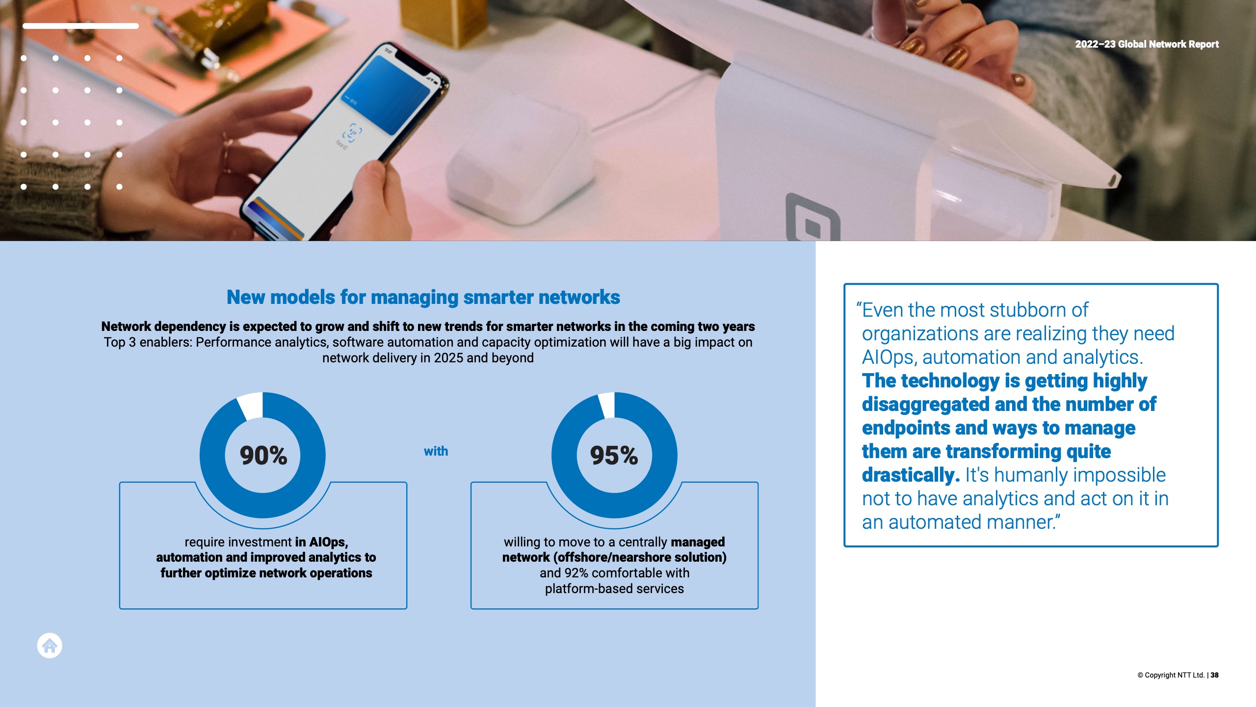 受访者表示,他们最关心的是安全、现代化,以及来自供应商的全栈服务,而不仅仅是成本。就网络管理而言,90% 以上的高管倾向选择 NaaS 模式,认为其优势在于可以灵活地扩大和缩小网络。此外,部署有效的 AIOps(智能运维)和自动化解决方案虽然简化了运营阶段的网络操作,但初始配置很复杂,这使得 NaaS 模式更具吸引力。