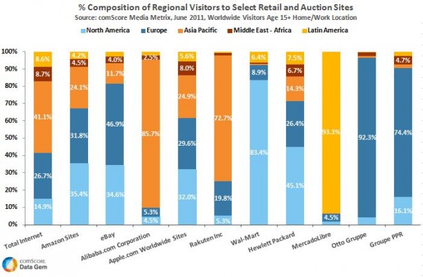 最近comScore的报告分析了全球最大的零售和拍卖网站在这些网站是如何渗透到不同地区的,亚马逊网站吸引了35.4%的观众来自北美,而欧洲占31.8%和亚太地区占24.1%。同样,Apple.com全球网站吸引了来自北美的游客的32.0%,而欧洲占29.6%的游客和亚太地区占24.9 %。